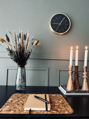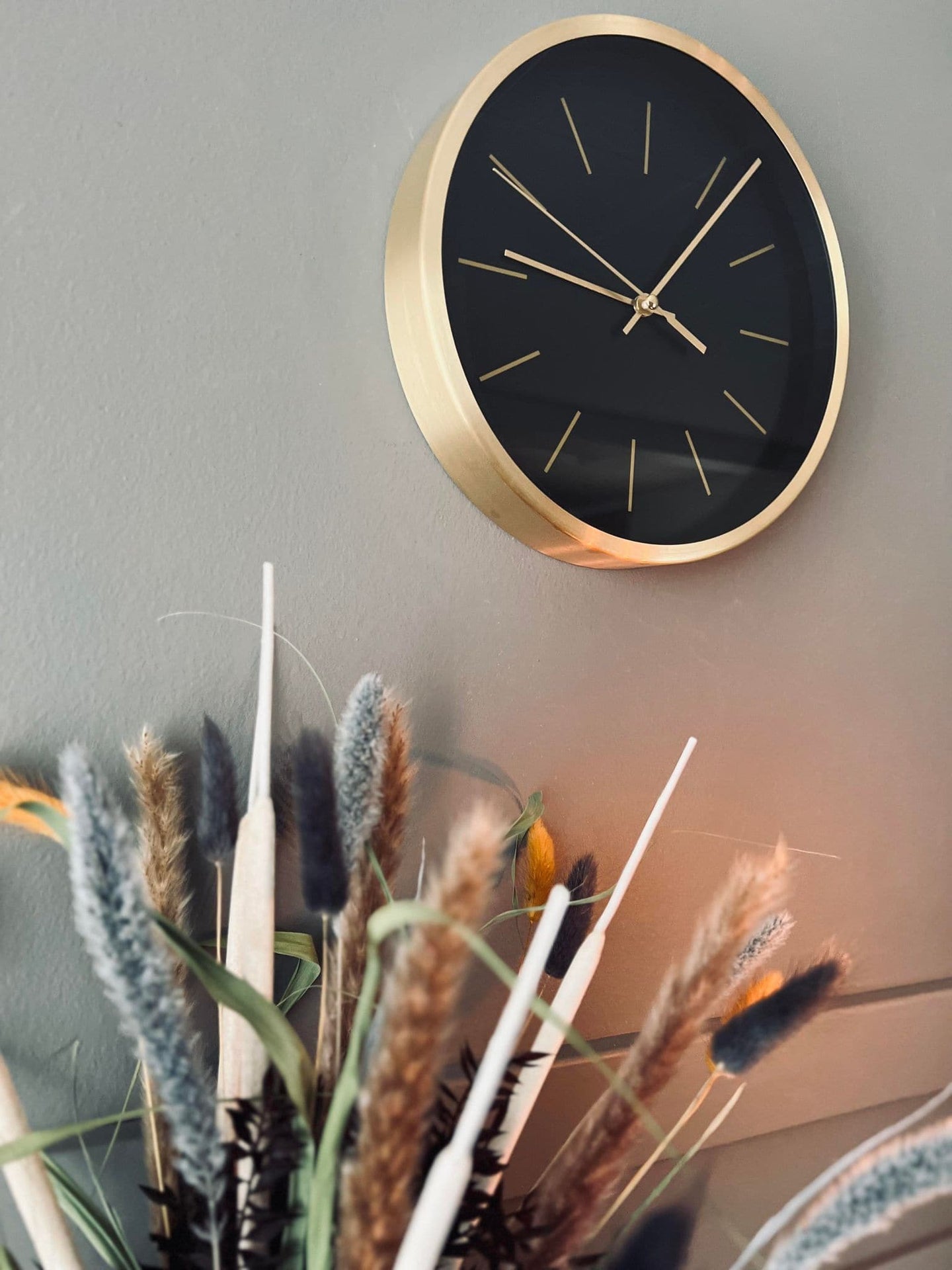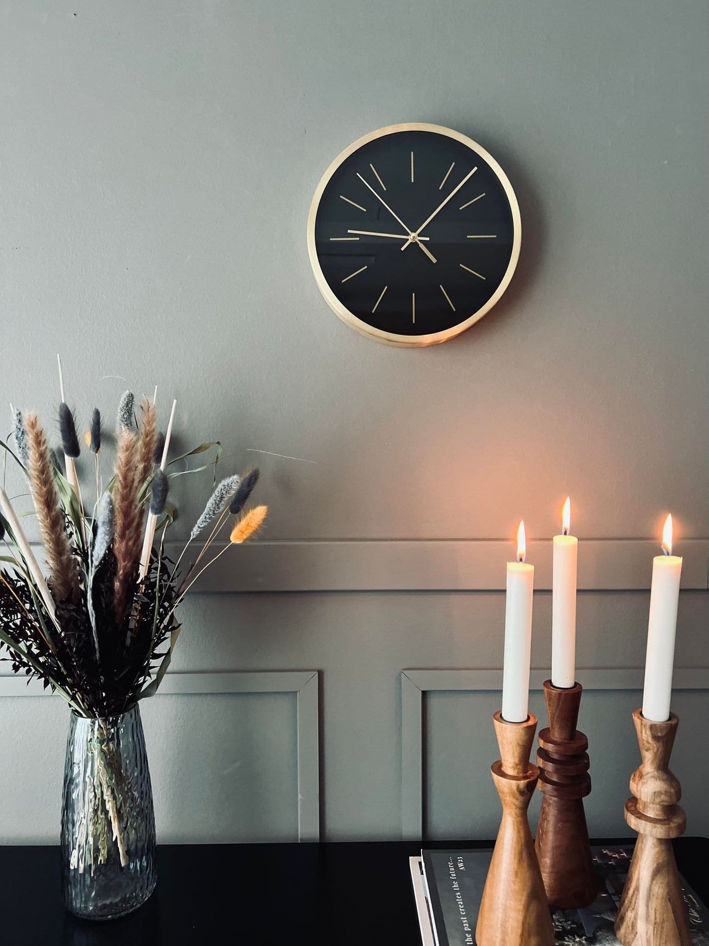 Veggklokken med en svart skive og messingkant gir et stilrent og sofistikert uttrykk som lett kan integreres i ulike interiørstiler. Denne kombinasjonen av farger og materialer skaper en visuell kontrast som gjør det lettere å lese tiden, samtidig som den tilfører rommet et snev av modernitet. Den svarte skiven gir en nøytral base, mens messingkanten tilfører varme og dybde.