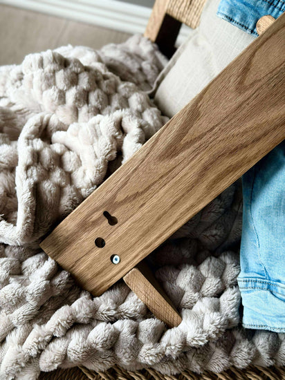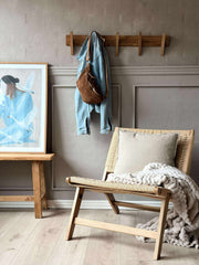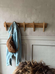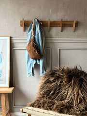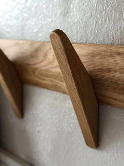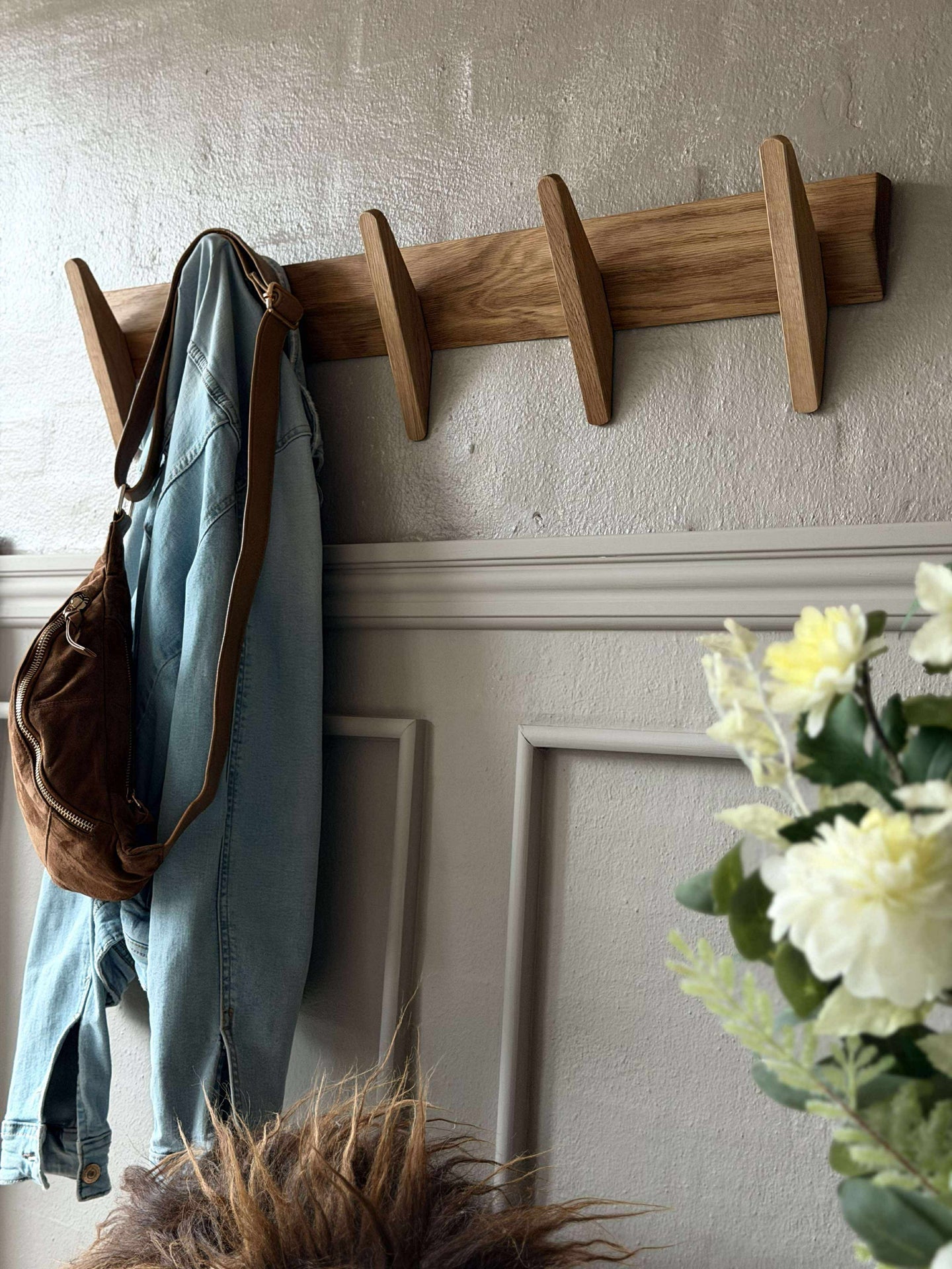 Knaggrekken er håndlaget av massiv ekte eik, noe som gir den en naturlig holdbarhet og styrke. Eikens tette strukturer bidrar til å motstå slitasje og gir en stabil og pålitelig løsning for å henge klær og tilbehør i entréen. Materialets naturlige skjønnhet og tidløse appell gjør at knaggrekken passer inn i ulike interiørstiler, samtidig som den opprettholder funksjonalitet og estetikk.