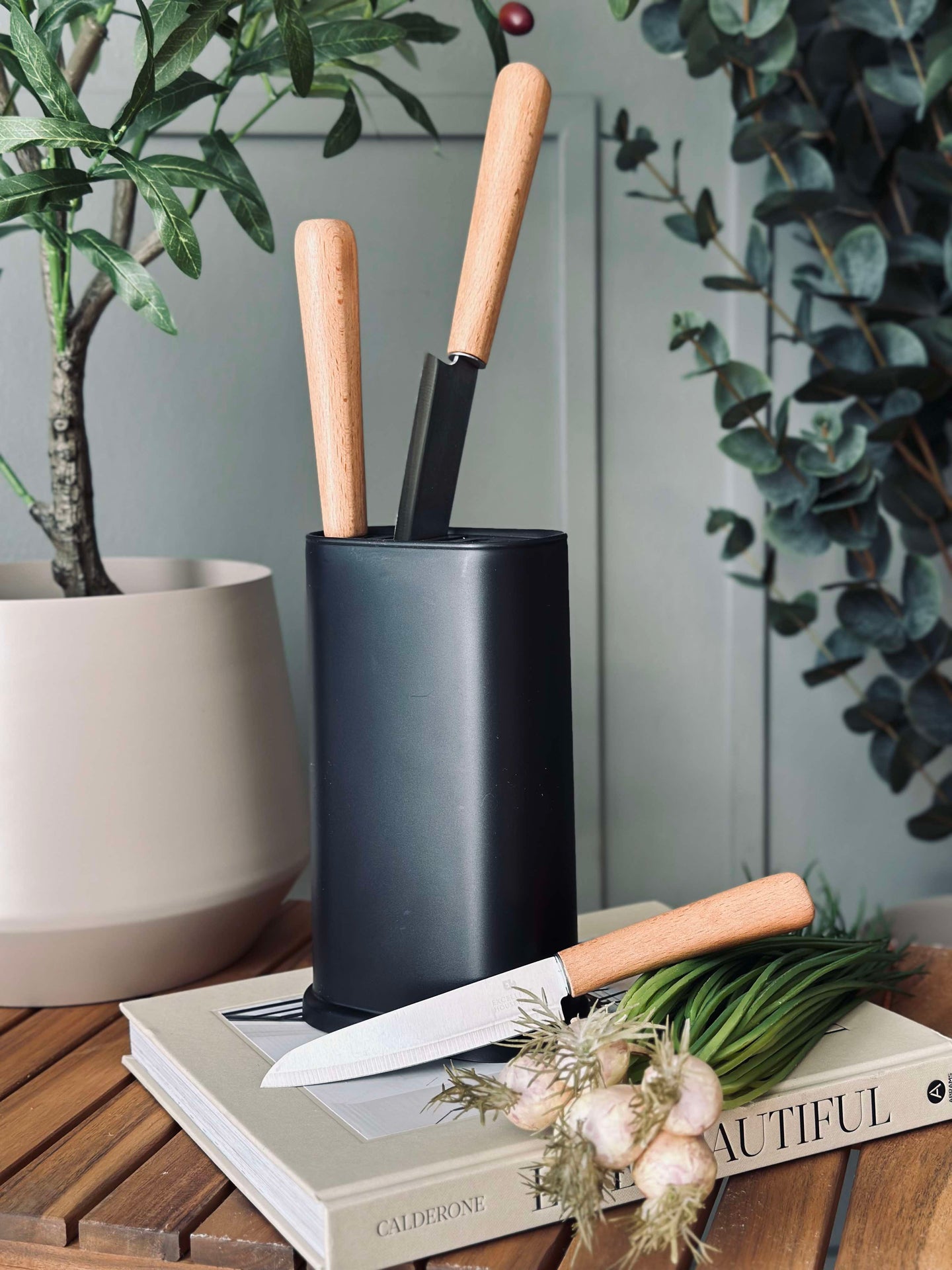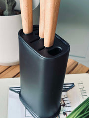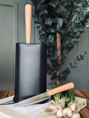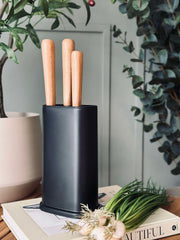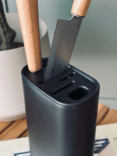 Knivblokken er laget av svart plast, noe som gir en moderne og stilren estetikk som passer godt inn i ulike interiørstiler. Plastmaterialet gjør blokken lett å vedlikeholde, da det er enkelt å tørke av og holde rent. I tillegg gir det en holdbar og robust løsning for trygg oppbevaring av kniver, samtidig som det beskytter knivbladene mot slitasje.