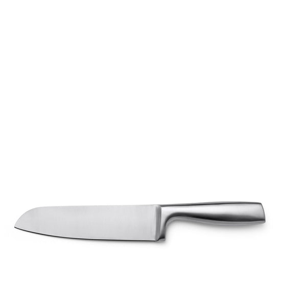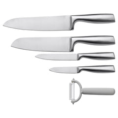 - Knivsettet består av 5 deler: kokkekniv, santoku-kniv, universalkniv, urtekniv og skreller