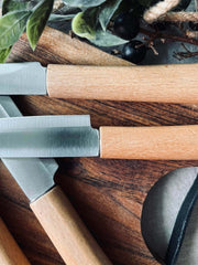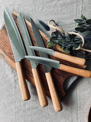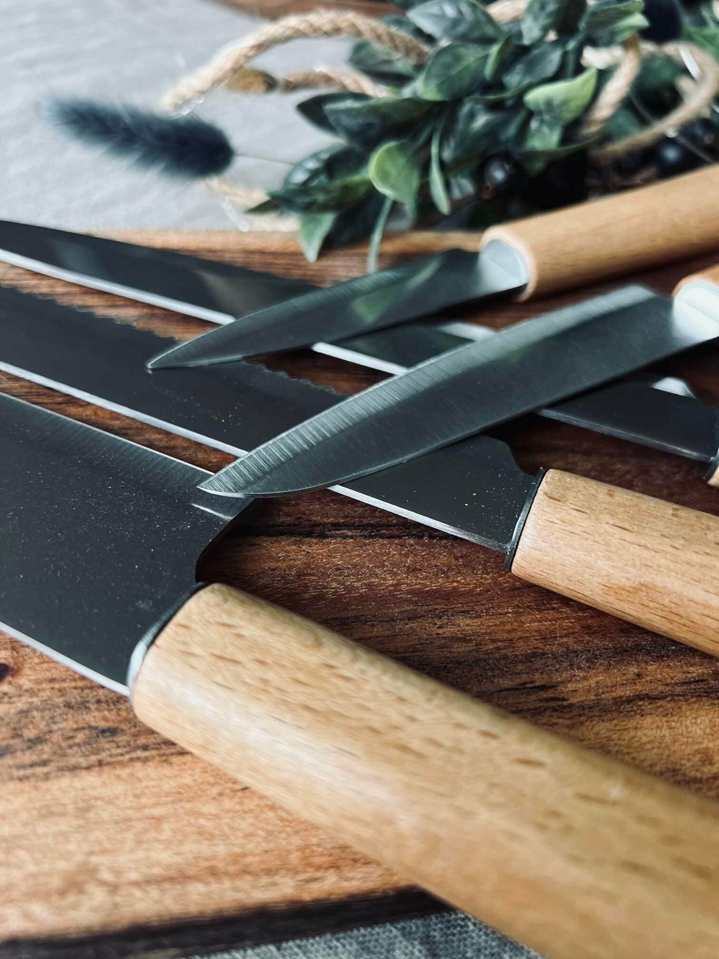 Skaftene i knivsettet er laget av ekte bøk, noe som gir en naturlig og behagelig følelse i hånden. Bøk er kjent for sin holdbarhet, noe som sikrer langvarig bruk uten at skaftene slites ut. Det gir også en varm estetikk som passer godt inn i mange kjøkkenstiler. Den naturlige teksturen gir et godt grep, noe som kan gjøre matlagingen mer komfortabel.