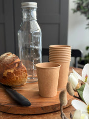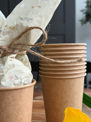Et praktisk sett med pappkopper når du vil dekke opp enkelt og raskt. Pakken inneholder 10 kopper i solid kvalitet, laget for engangsbruk ved sammenkomster og utendørs arrangementer. Med en kapasitet på 250 ml per kopp er de egnet for både kalde og varme drikker i hverdagslige serveringer.