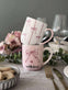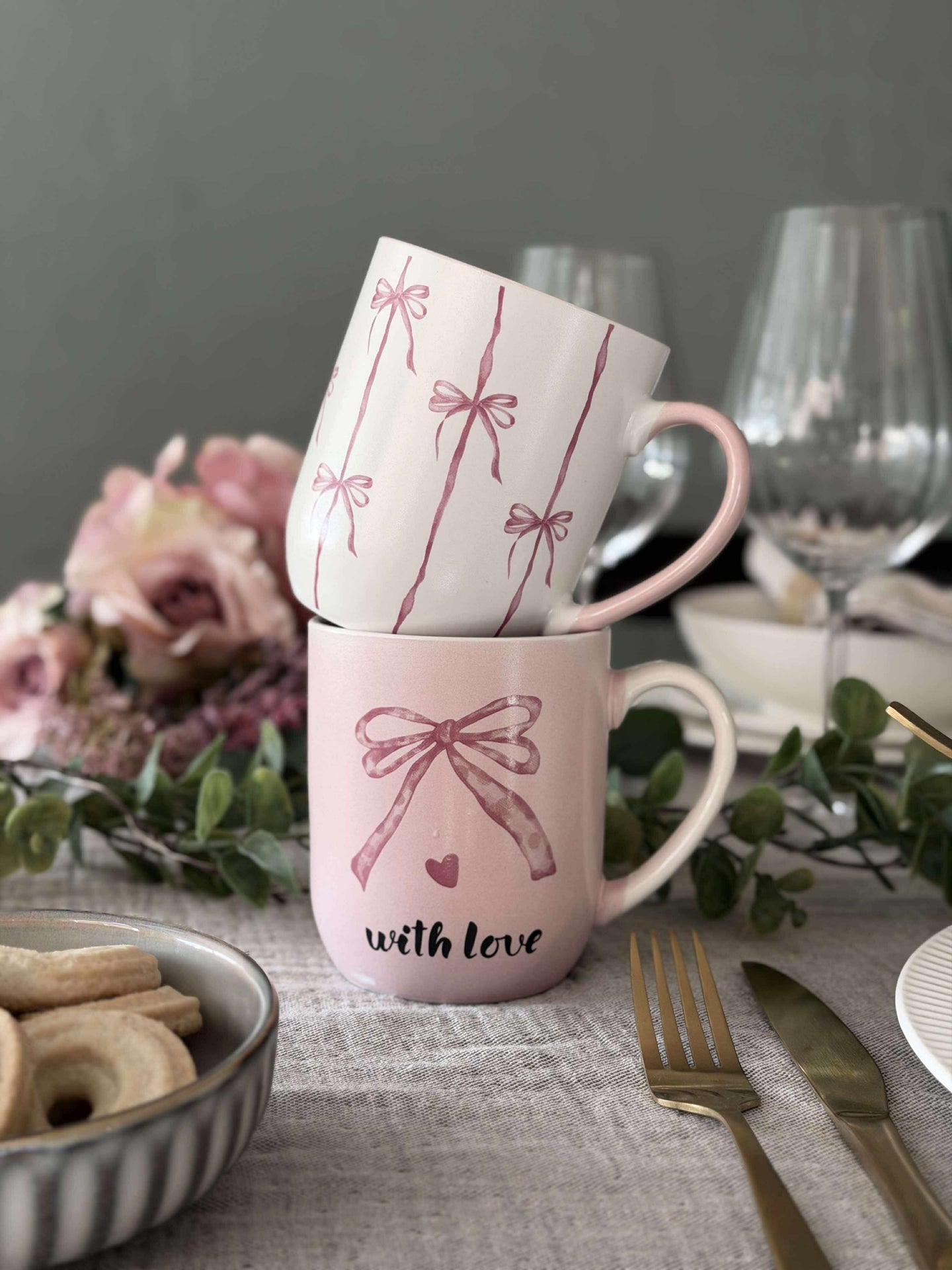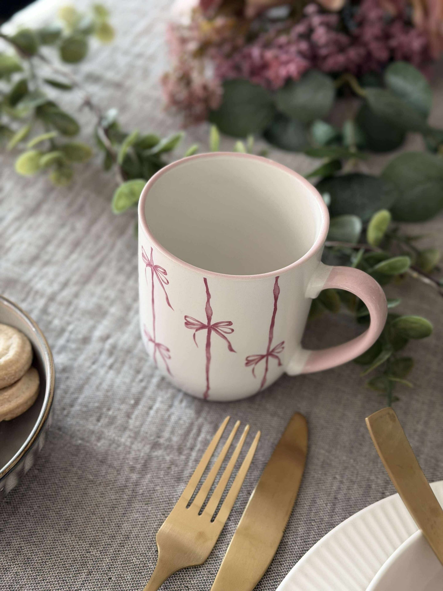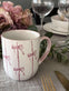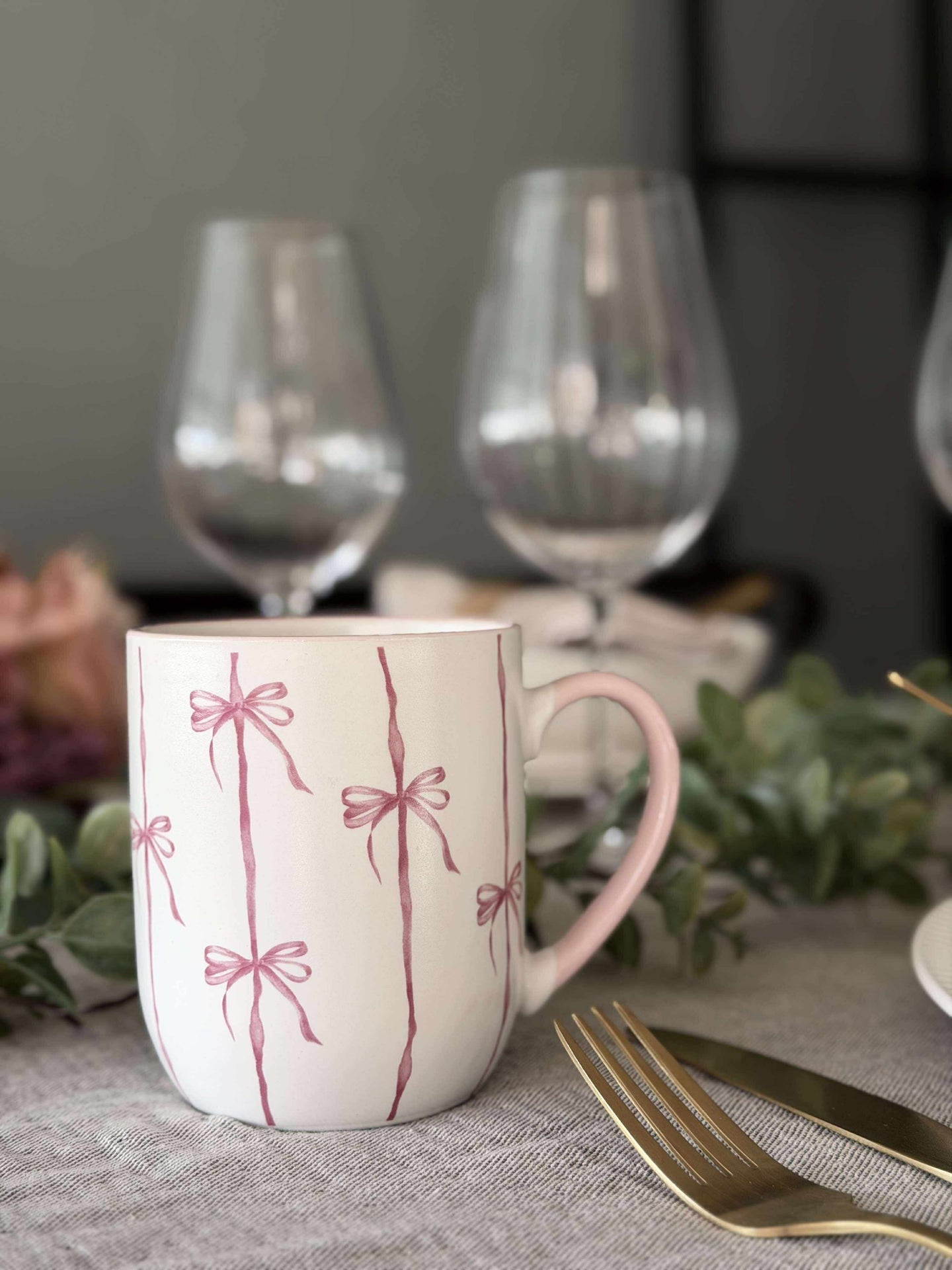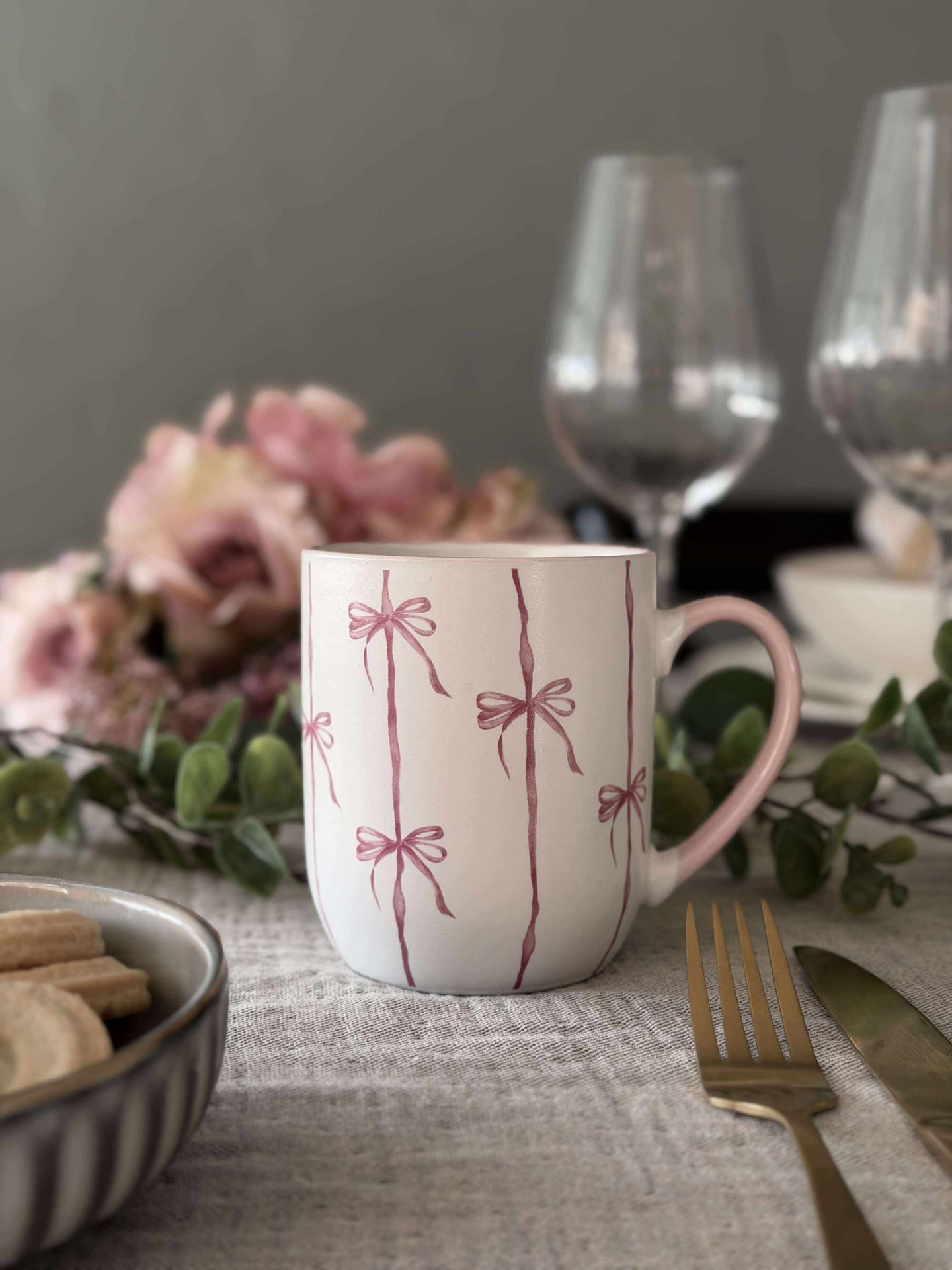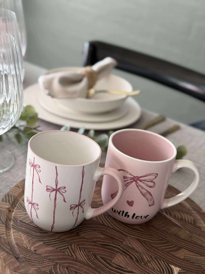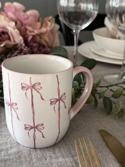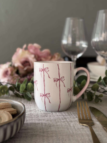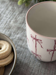 Kruset er laget i stentøy og har en hvit bunnfarge med striper. Sløyfedesignen gir et lett og sjarmerende uttrykk som skiller seg ut uten å ta for mye plass på bordet.