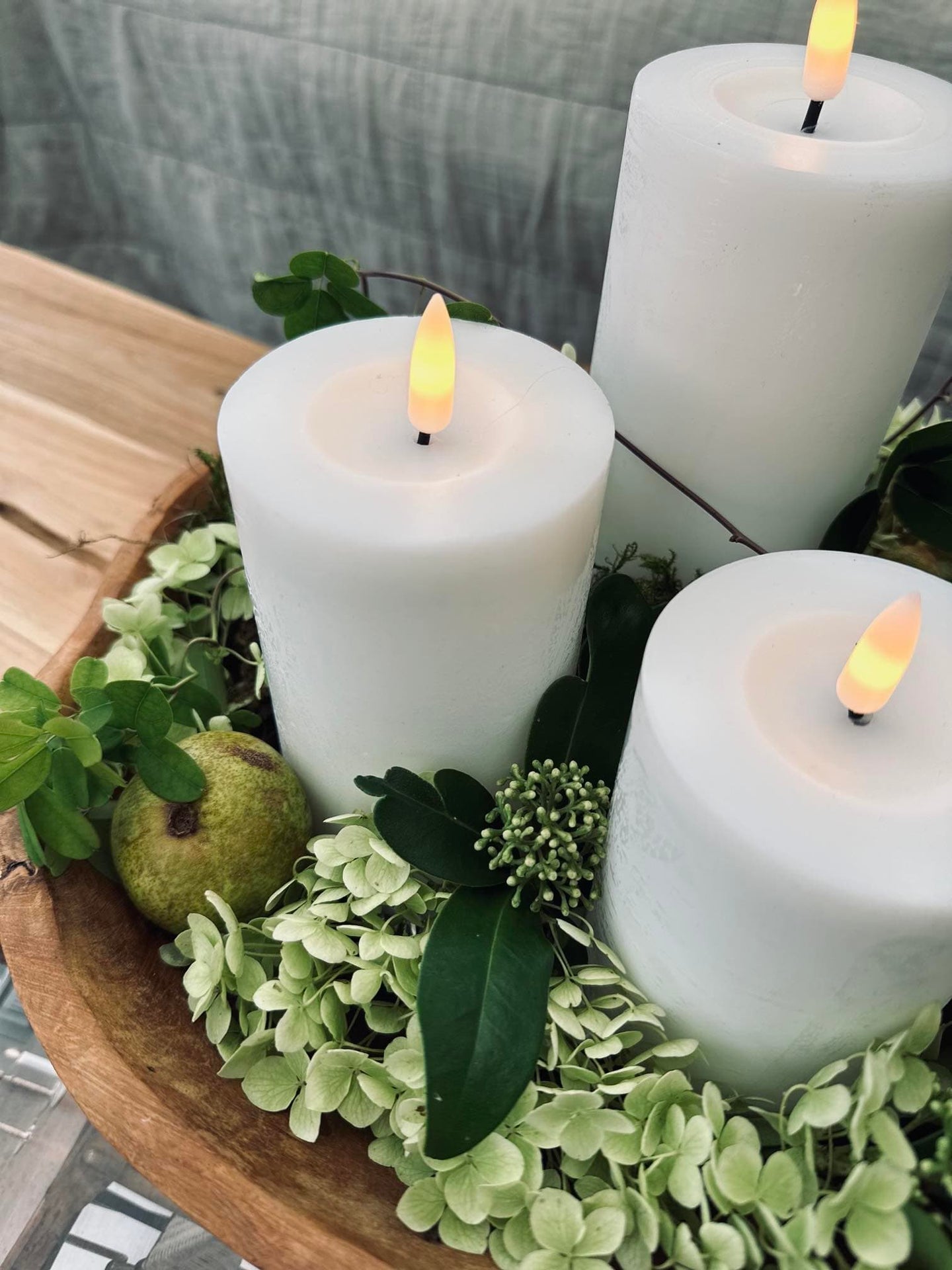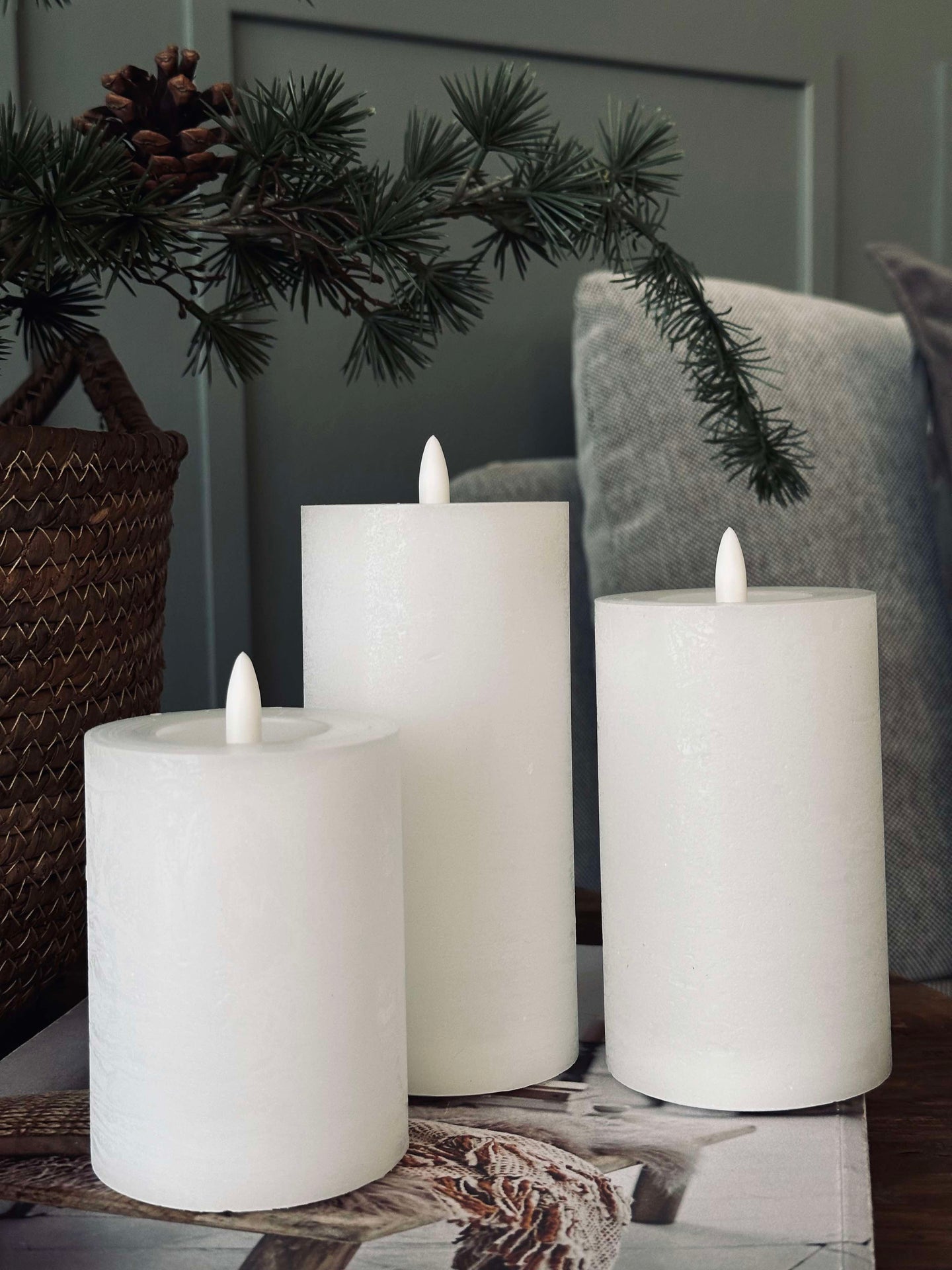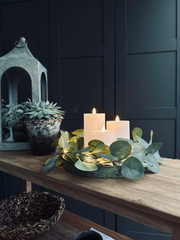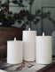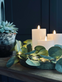 - Settet inneholder tre vokslys med diameter på 7,5 cm og høyder på 10, 12,5 og 15 cm