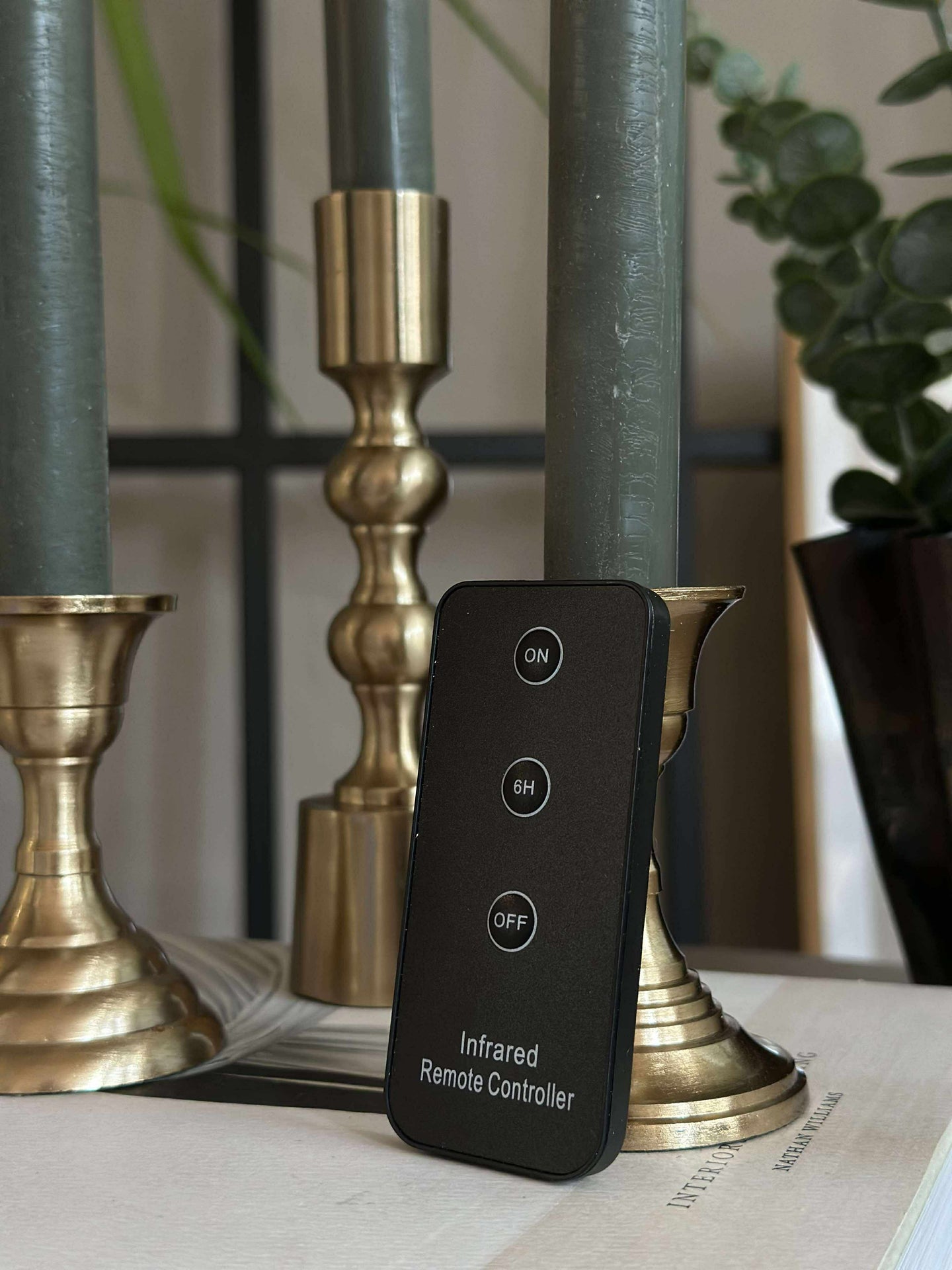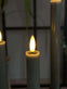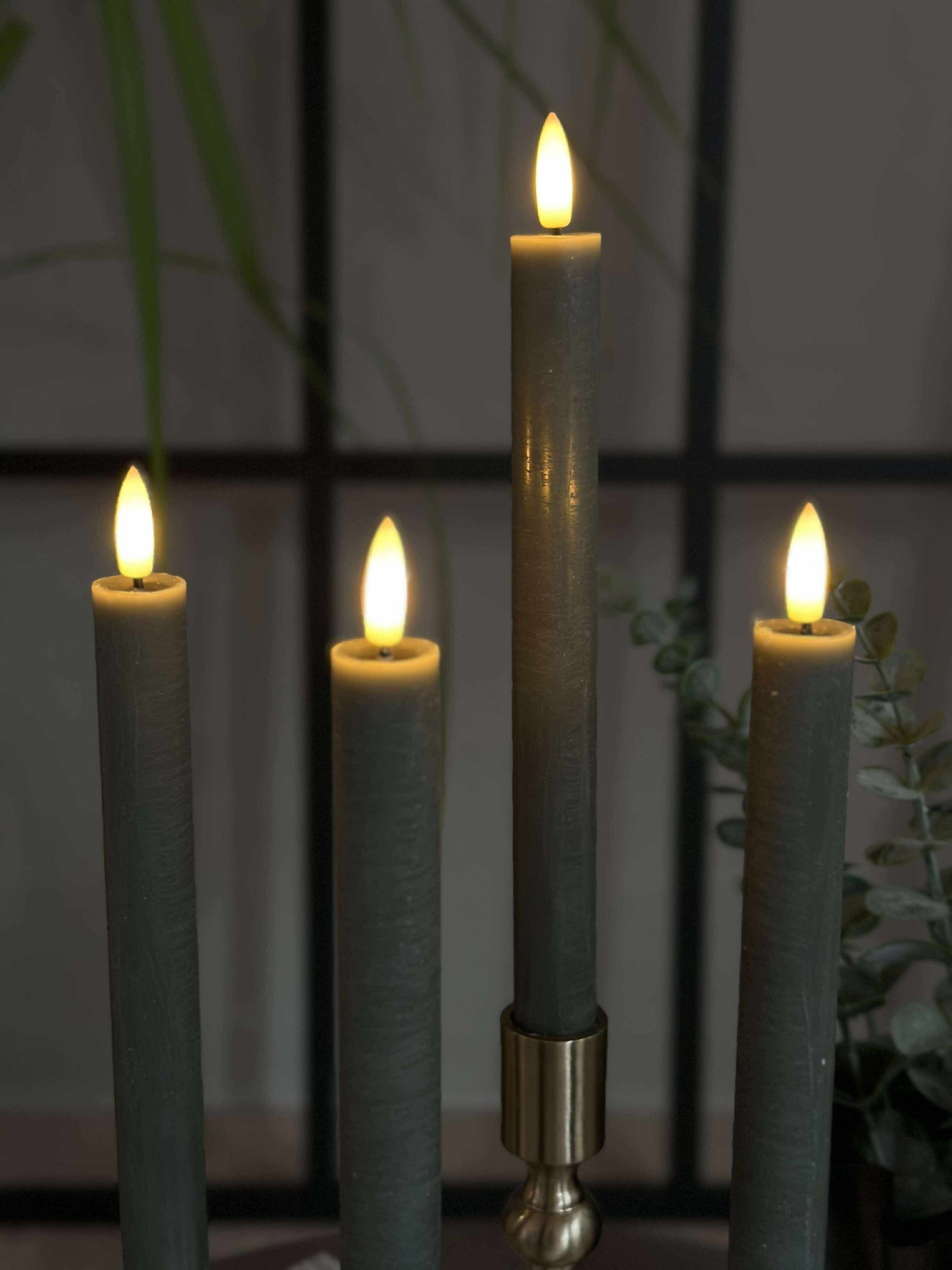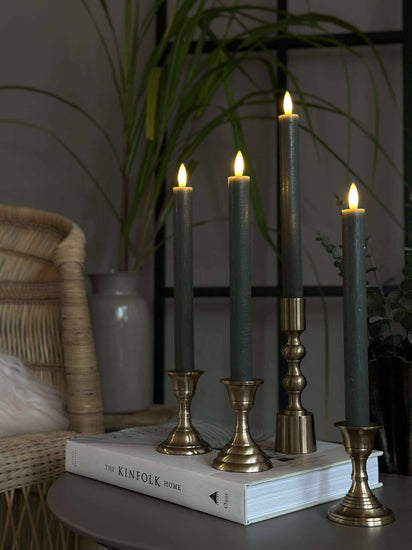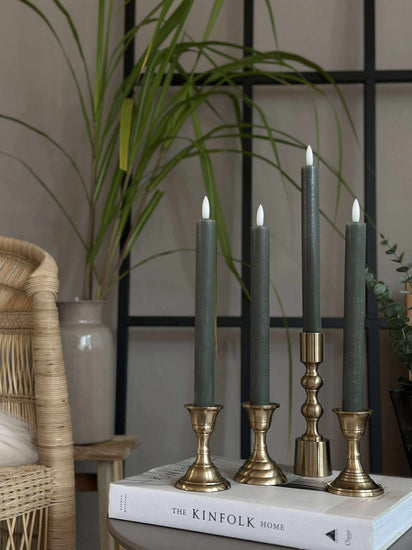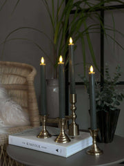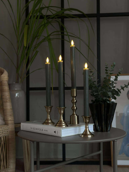 Stakelysene er laget i plast og har en grønn farge som tilfører en dempet, dekorativ kontrast. Den varme hvite flammen understøtter en koselig stemning uten å ta fokus fra resten av borddekningen.