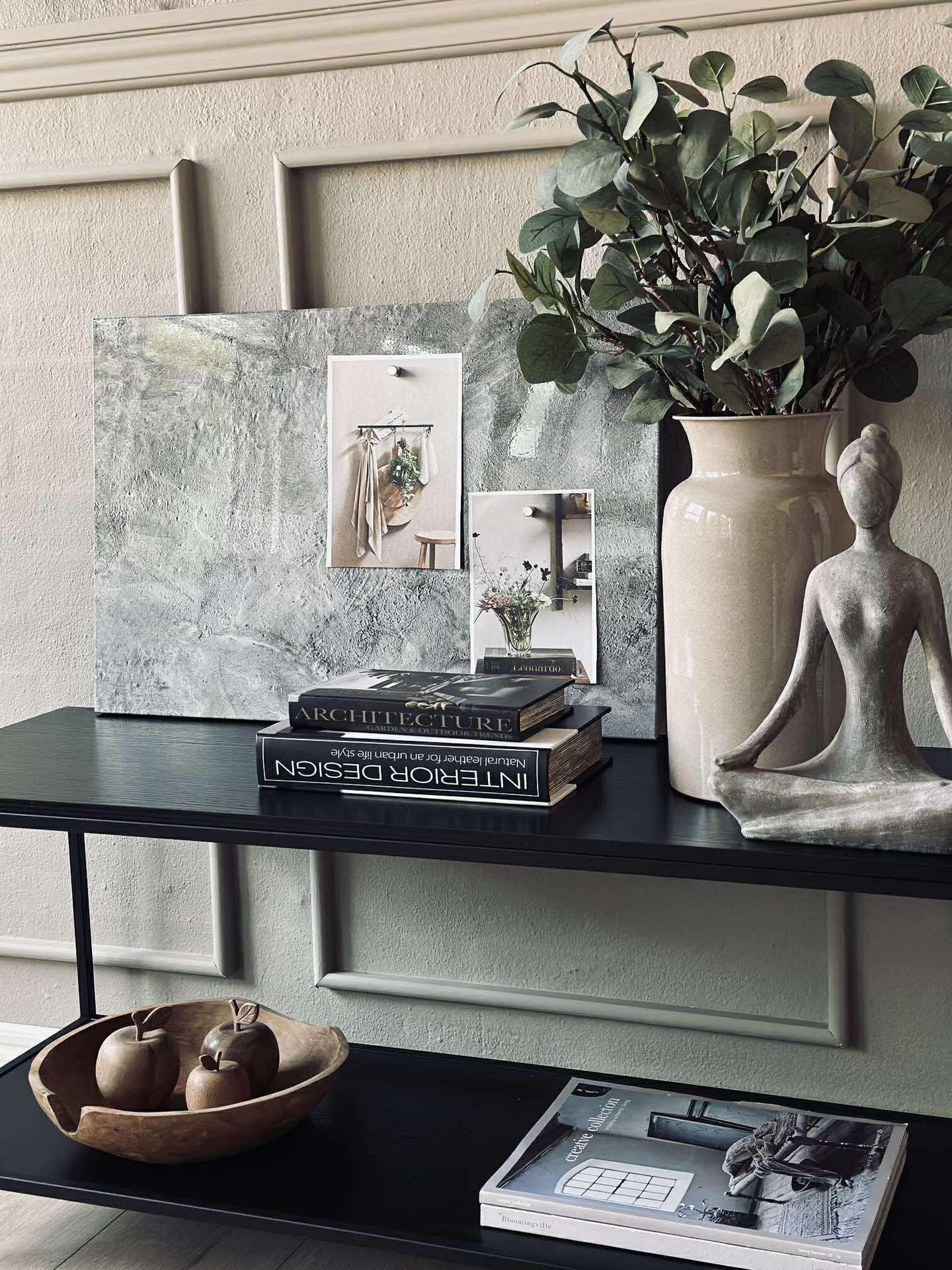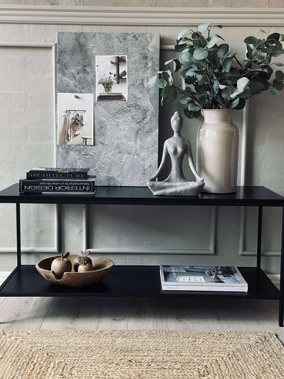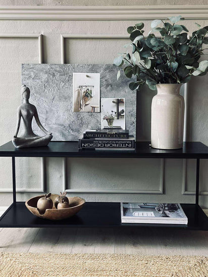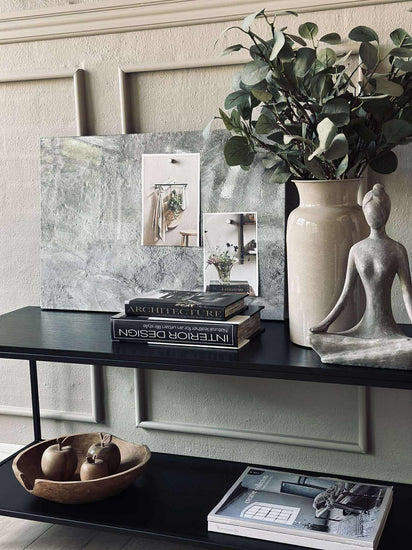 Ståltavlen kombinerer et moderne betongutseende med praktisk beskyttelse, takket være den laminerte folien. Denne overflaten gir ikke bare et industrielt preg til rommet, men sikrer også holdbarhet mot riper og slitasje. Den beskyttende folien gjør at tavlen beholder sitt stilige utseende over tid, samtidig som den er lett å rengjøre og vedlikeholde.