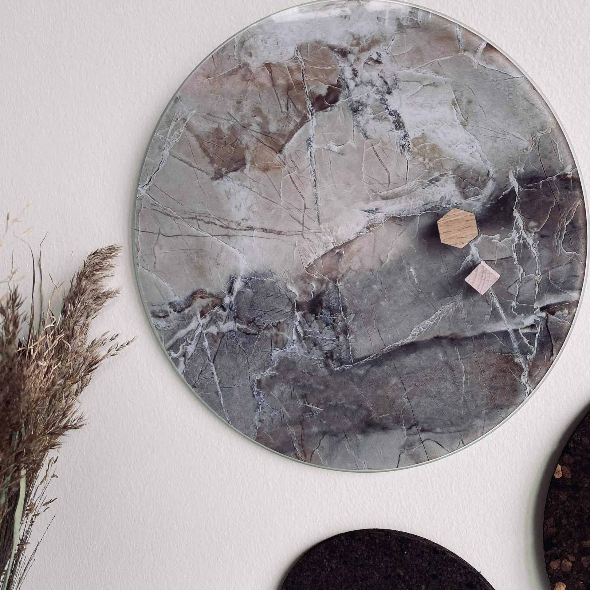 Magnetisk sirkeltavle Ø35 cm med beige marmor-look på glass. Den runde formen skaper et rolig, dekorativt element på veggen og gir et praktisk sted for notater, bilder og små beskjeder.