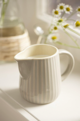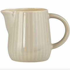 Melkekanne - Latte er en liten melk- og fløtemugge i steintøy i en rolig beige nyanse. Det strukturerte, vevde uttrykket gir et varmt og naturlig utseende, som passer godt inn på bordet – både til hverdags og når du dekker litt ekstra til kaffe og te.