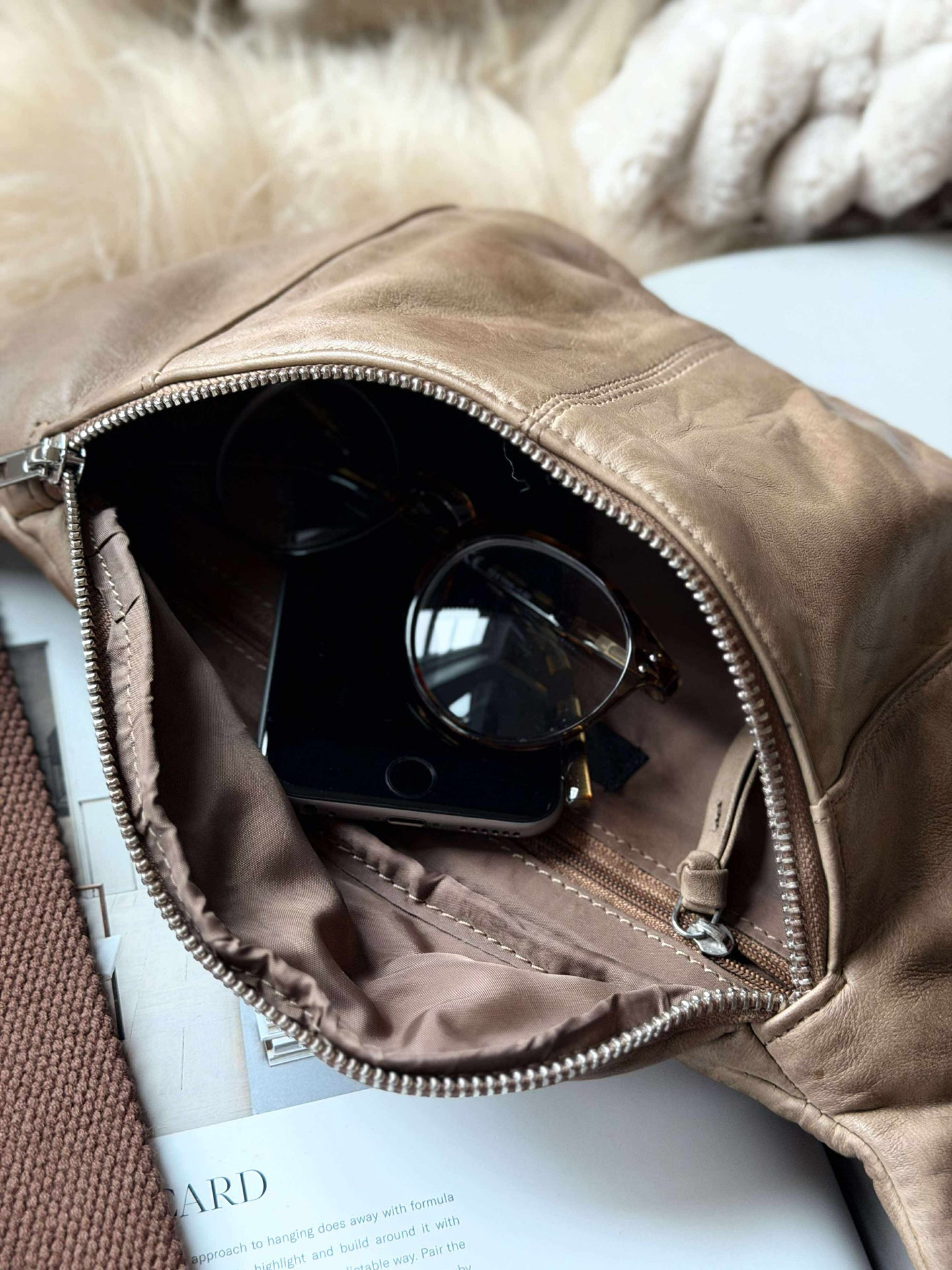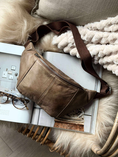 Materialet er 100 % ekte lammeskinn, noe som gir hver bumbag en særpreget karakter. De naturlige variasjonene i farge gir et distinkt preg, som gjør at ingen to beltetasker er like. Lammeskinnet gir en myk og behagelig følelse, samtidig som det gir en robust og holdbar overflate. Denne kombinasjonen av komfort og holdbarhet gjør det til et ideelt valg for hverdagsbruk.