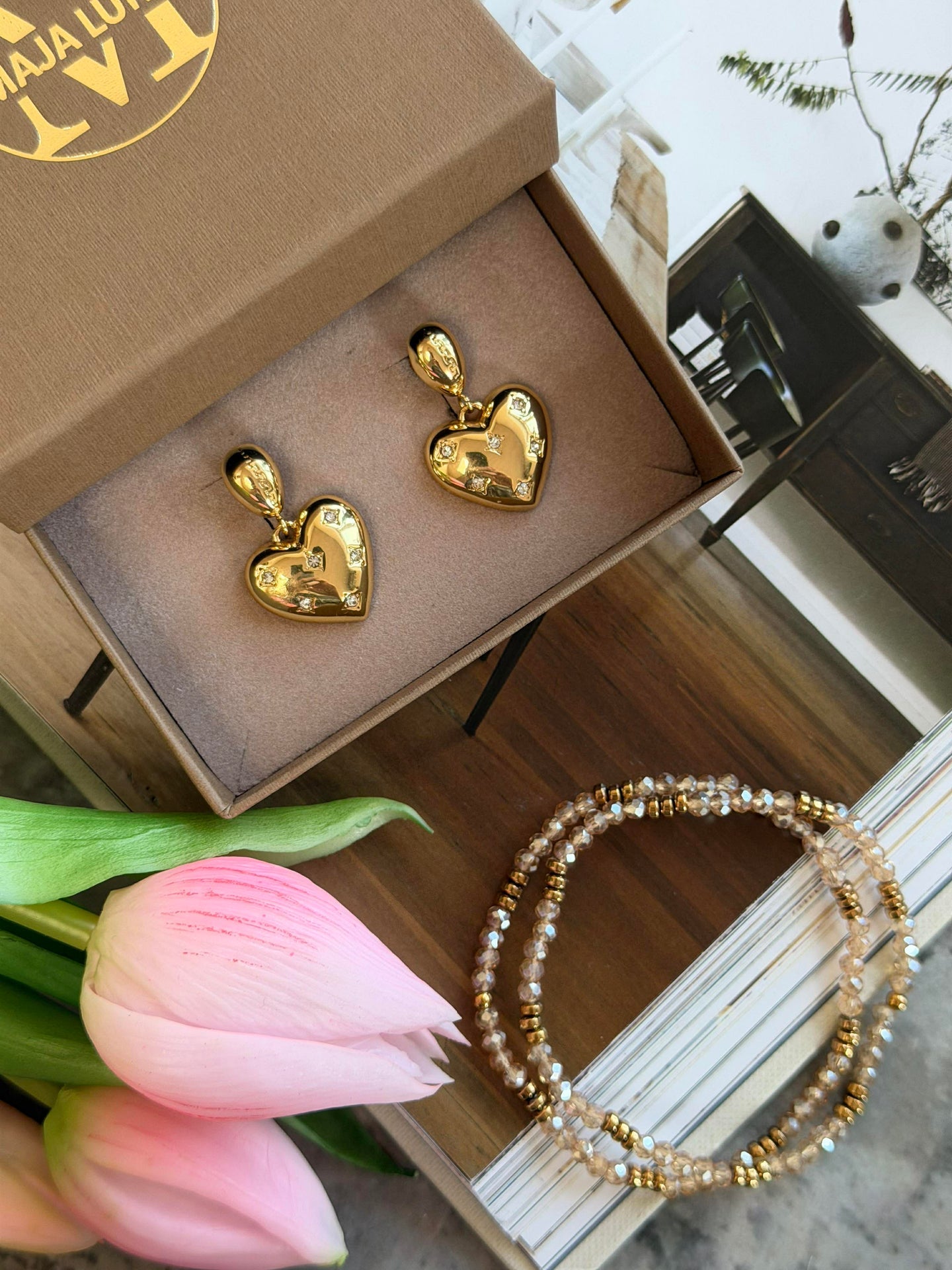 Øreringer Mimi – Forgylt er et par ørestikkere i gulllook, som fungerer som et tydelig statement i antrekket ditt. De blanke hjertene er prydet med klare CZ-zirkoner, som tilfører et rent og klassisk uttrykk. Et smykke som er lett å style når du vil tilføre litt ekstra glans.
