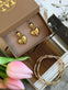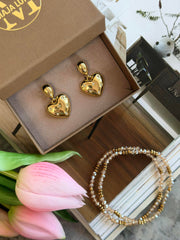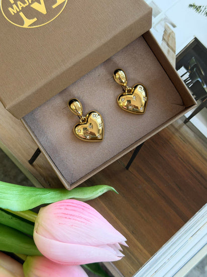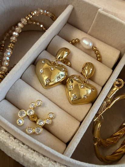 Øreringene er forgylt/gullbelagt og har et ensfarget, gyllent uttrykk. Designet kombinerer blanke hjerter med klare CZ-zirkoner for et elegant, skinnende finish.