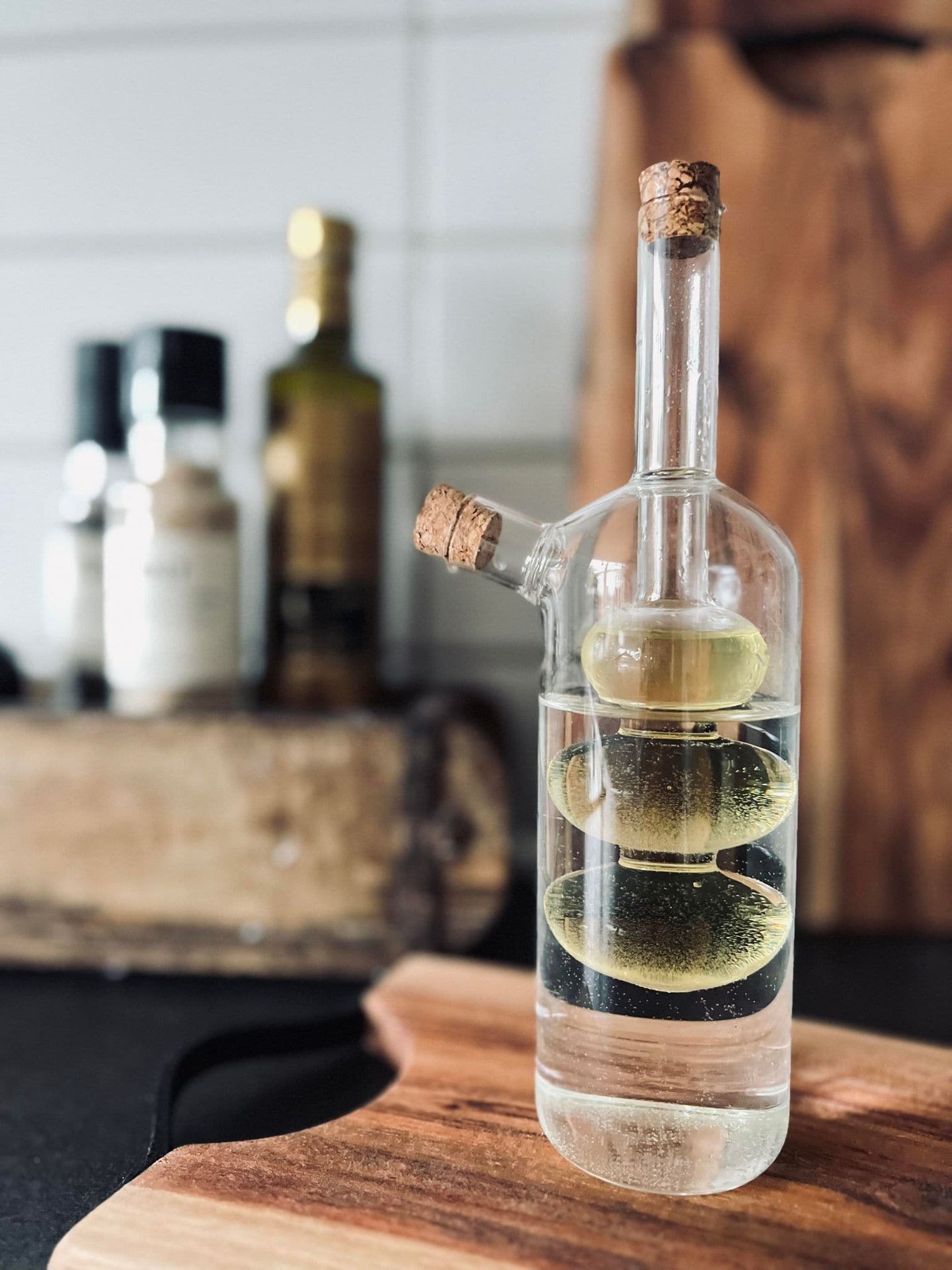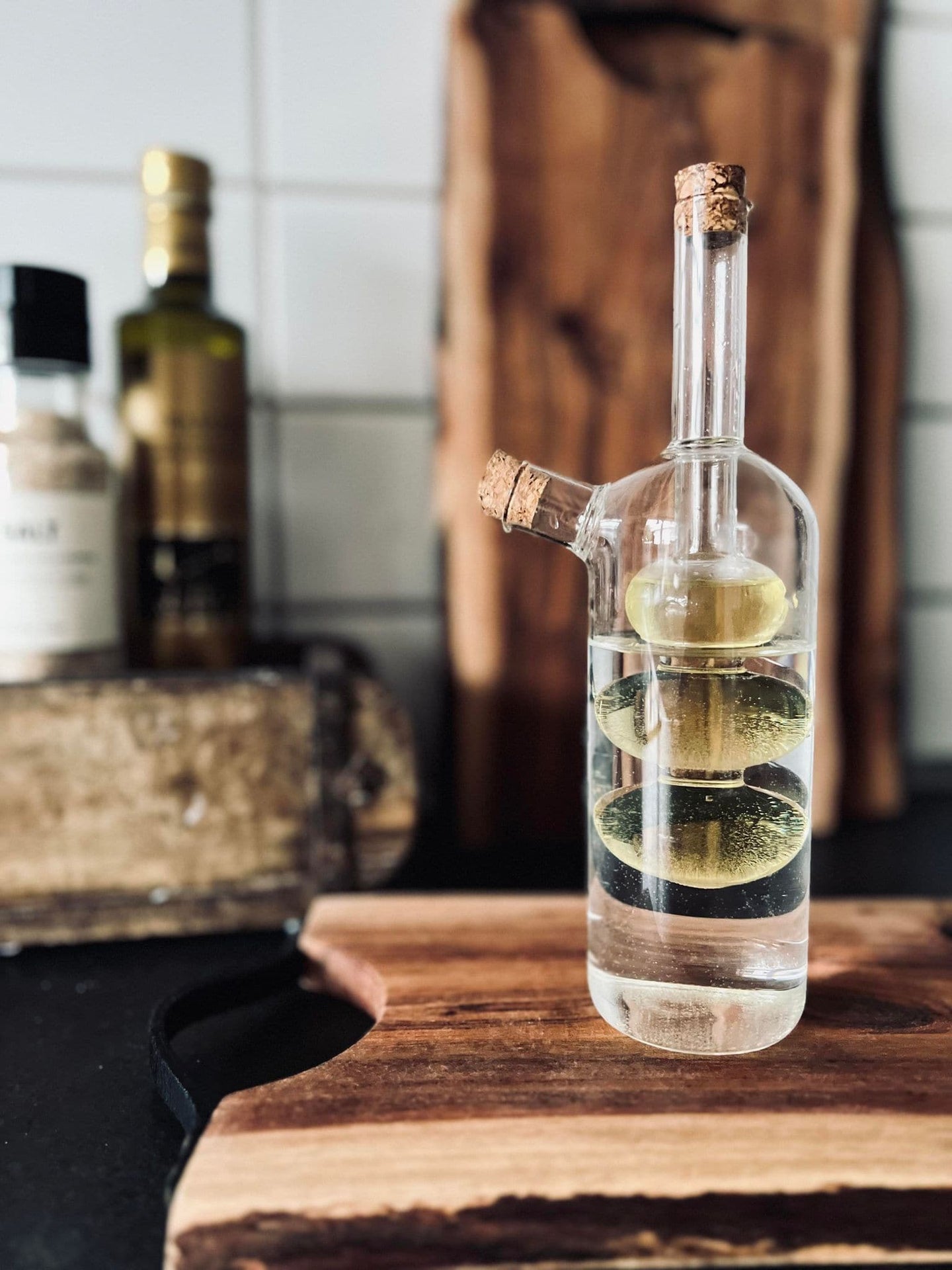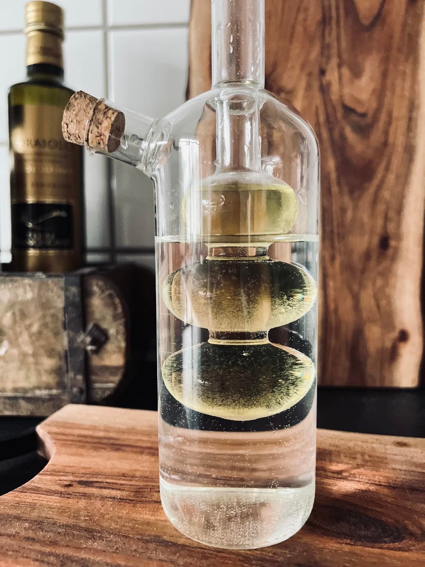 Sliter du med å holde kjøkkenet ryddig og organisert? Denne flasken gir en praktisk løsning for å oppbevare to forskjellige typer olje eller eddik i én beholder. Det enkle designet bidrar til å spare plass og redusere rot på kjøkkenbenken.