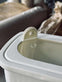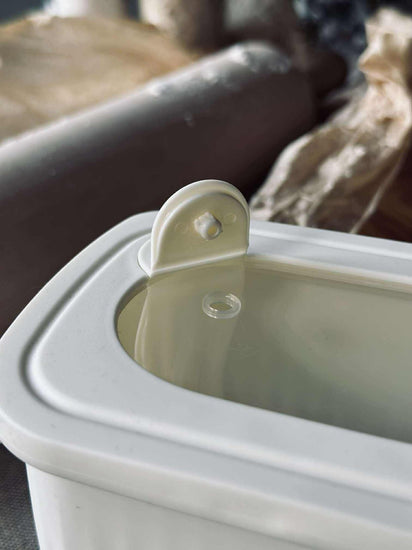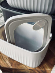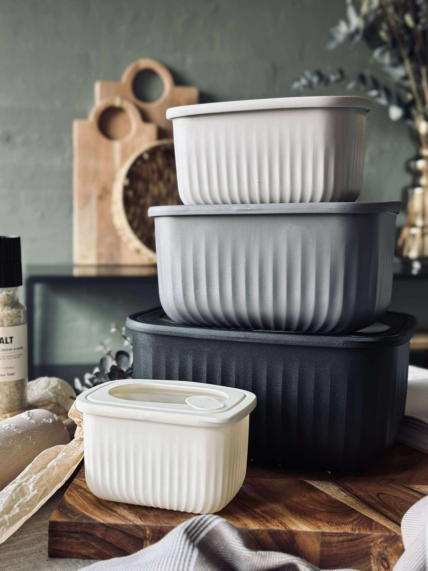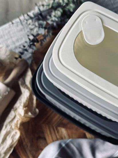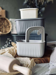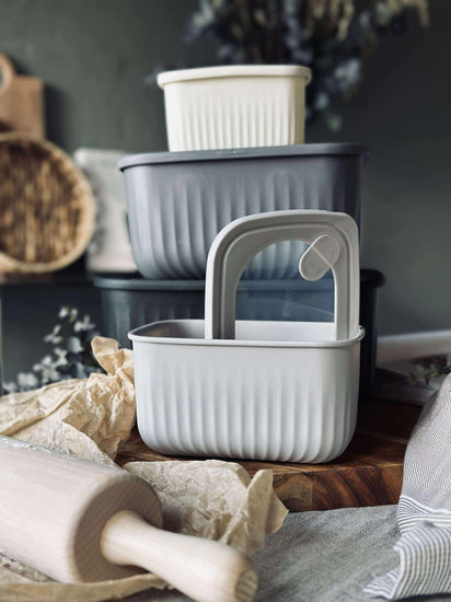 Oppbevaringsboksene er laget i plast og har et ensfarget design som passer inn i et rolig kjøkkenuttrykk.