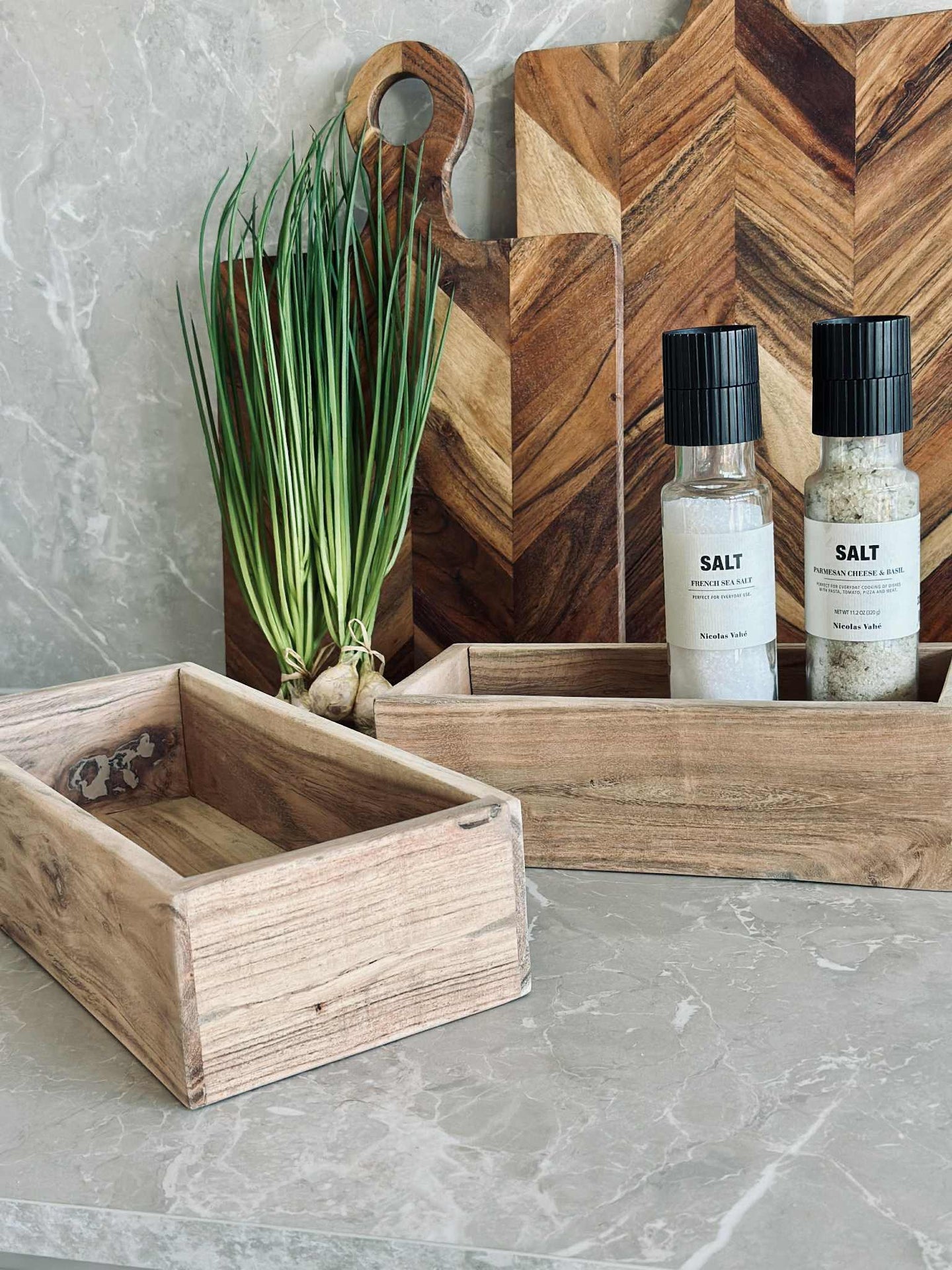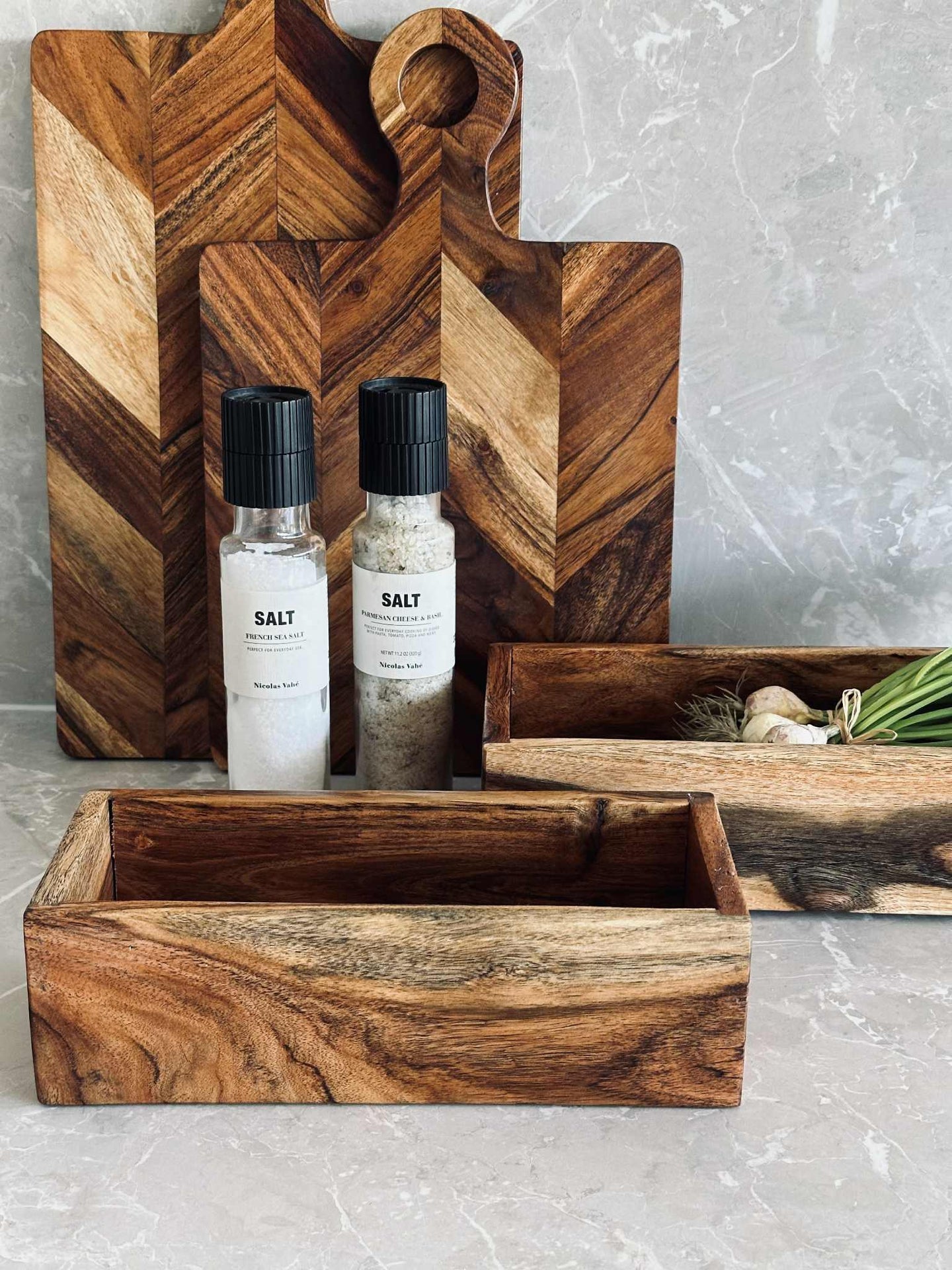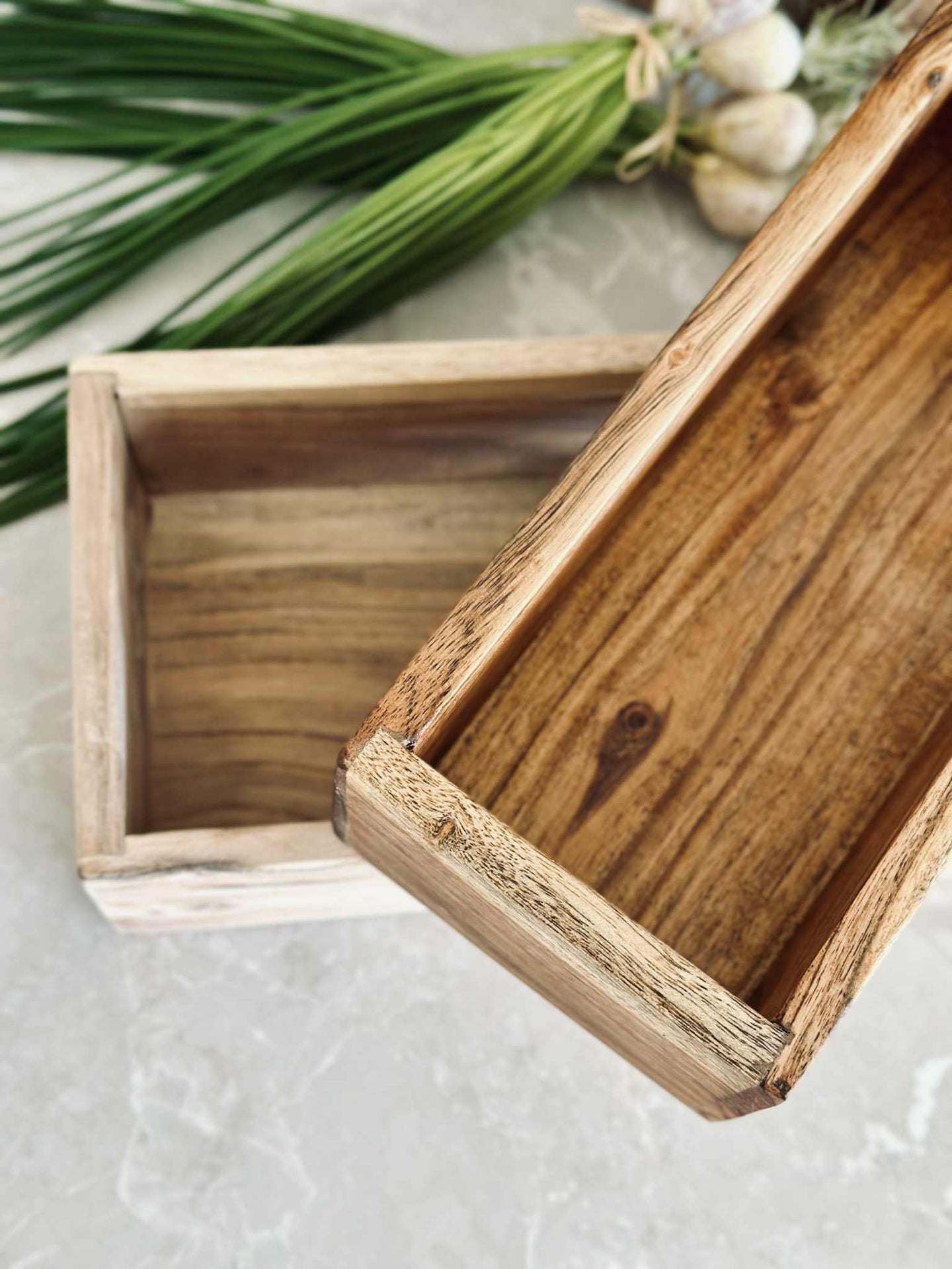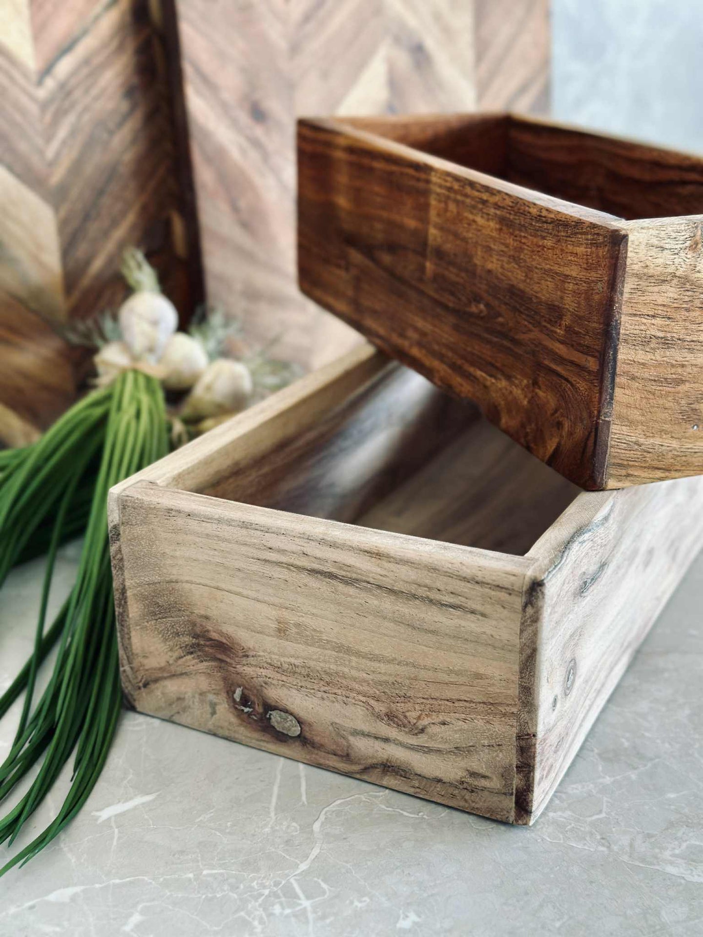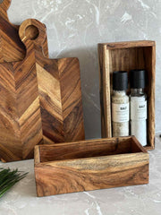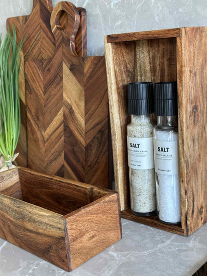 Oppbevaringskasser laget av akasietre gir en naturlig holdbarhet som tåler daglig bruk. Akasietreets tette kornstruktur gir en robust og stabil konstruksjon, samtidig som det tilfører en varm estetikk til interiøret. Materialets naturlige motstand mot fuktighet bidrar til å beskytte innholdet, noe som gjør det til et ideelt valg for ulike oppbevaringsbehov i hjemmet.