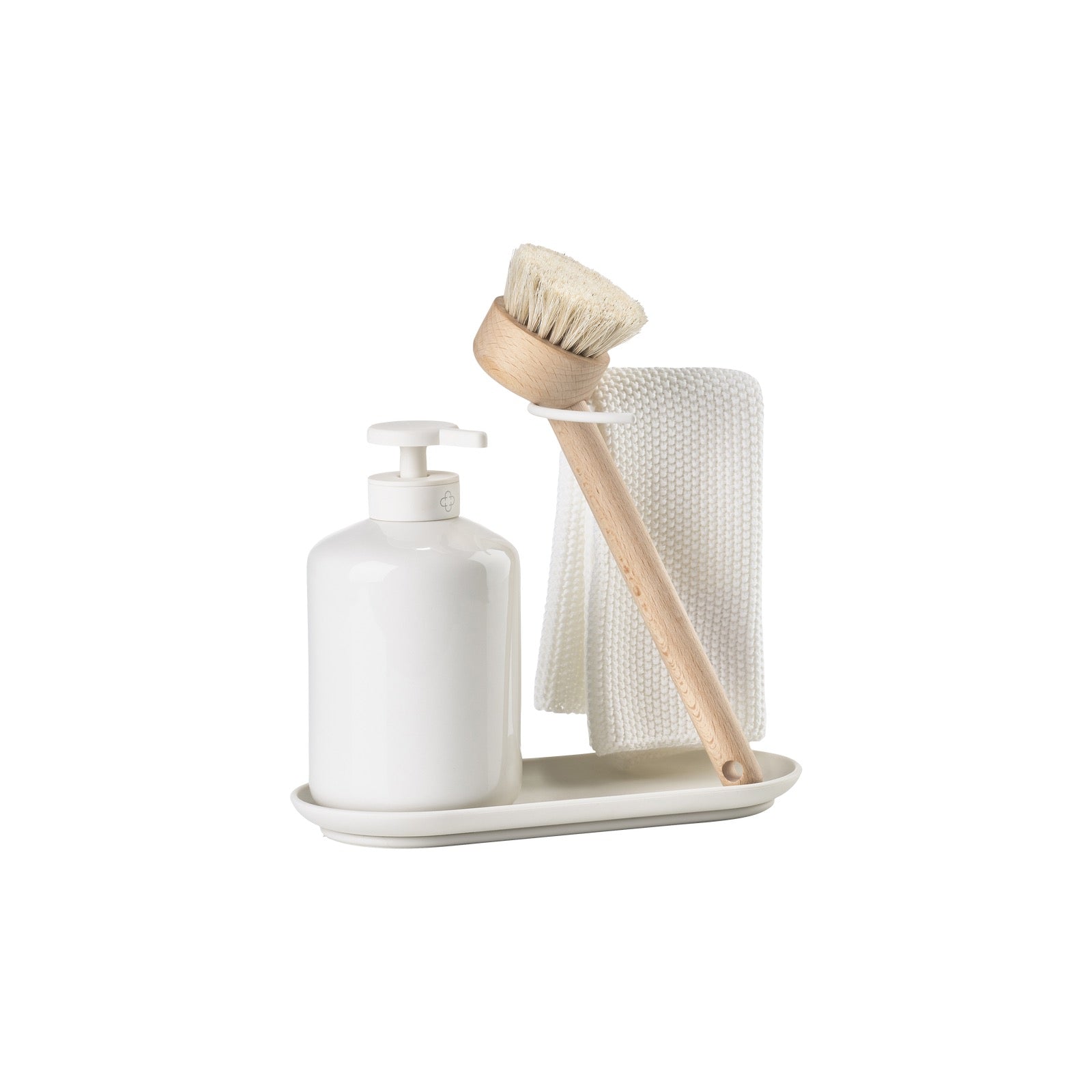 - Oppvasksettet inkluderer en praktisk holder, en såpedispenser, en oppvaskbørste og en klut