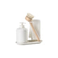 Såpedispenseren i dette oppvasksettet er laget av solid keramikk med en sylindrisk form, noe som gir den en robust og stabil struktur. Keramikken sikrer holdbarhet og enkel rengjøring, mens den sylindriske formen gjør det enkelt å håndtere og fylle på såpe. Dette designet bidrar til en praktisk oppvaskopplevelse, samtidig som det gir et stilrent inntrykk på kjøkkenbenken.