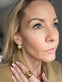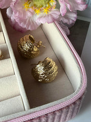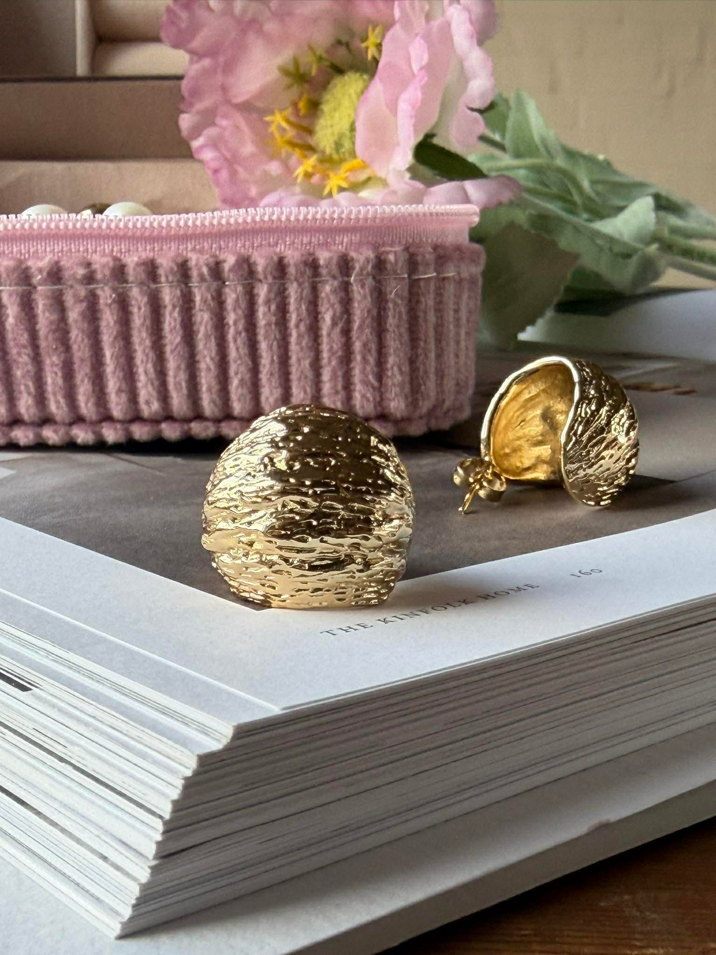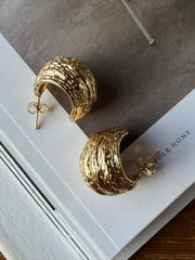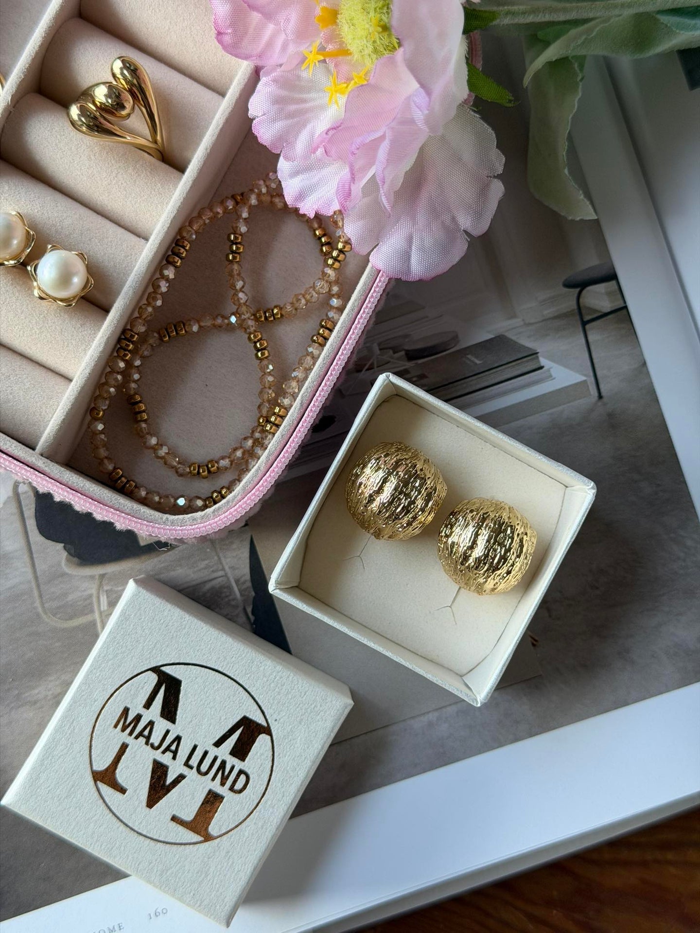 Øringene er fremstillet i rustfritt stål og belagt med gull. Den forgyldte overflaten gir et varmt, gyllent skjær, som fremhever det statementpregede uttrykket og de rene linjene i formen.