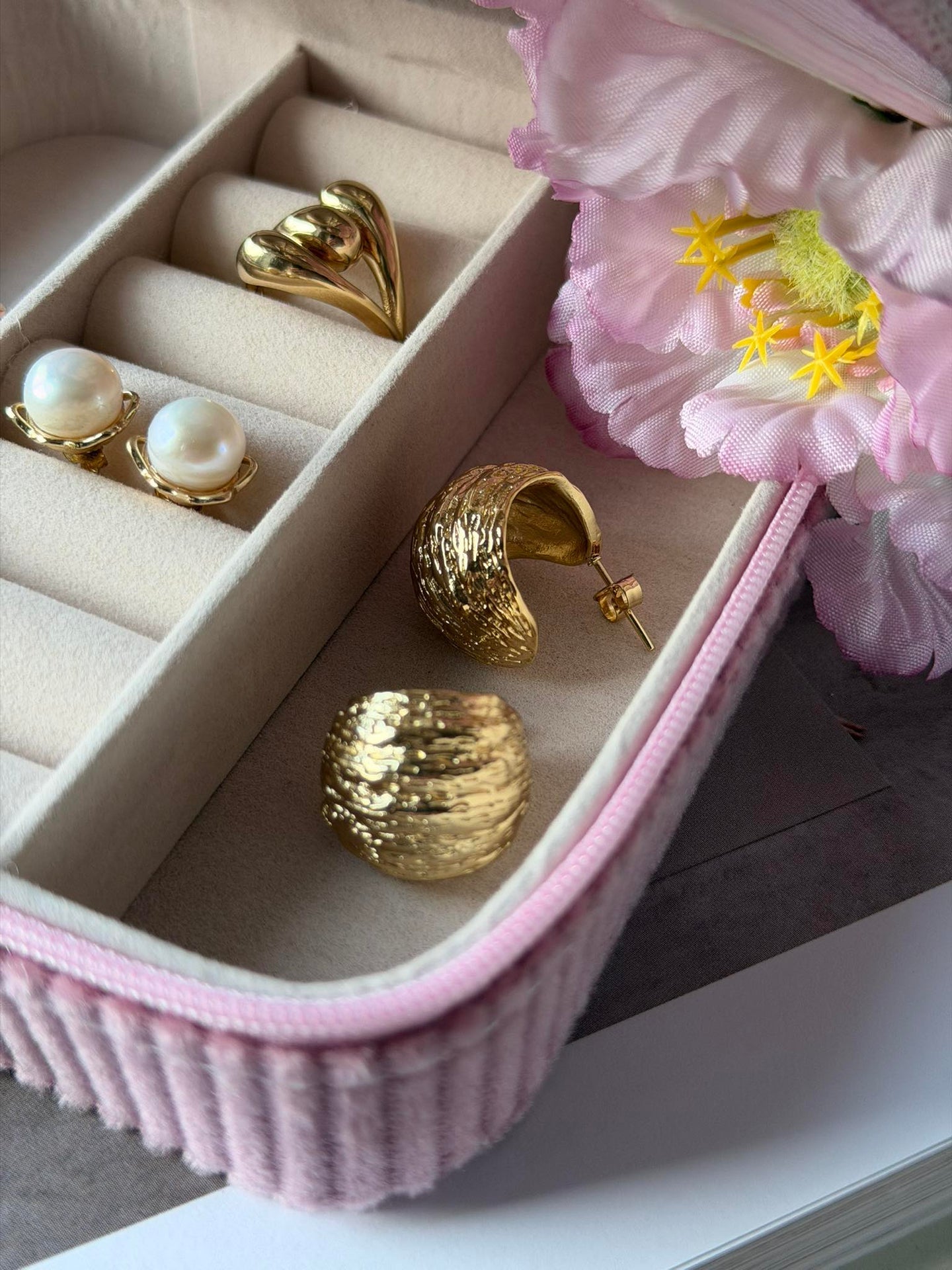 Øreringer MIRELLA - forgylt er superkule statement-øreringer, som gir et markant og vakkert smykkeuttrykk. De er laget i rustfritt stål med gullbelegg, som understreker den varme glansen i designet. Formen fremstår tydelig og elegant, så øreringene står sterkt både alene og som en del av et mer lag-på-lag stylingunivers.