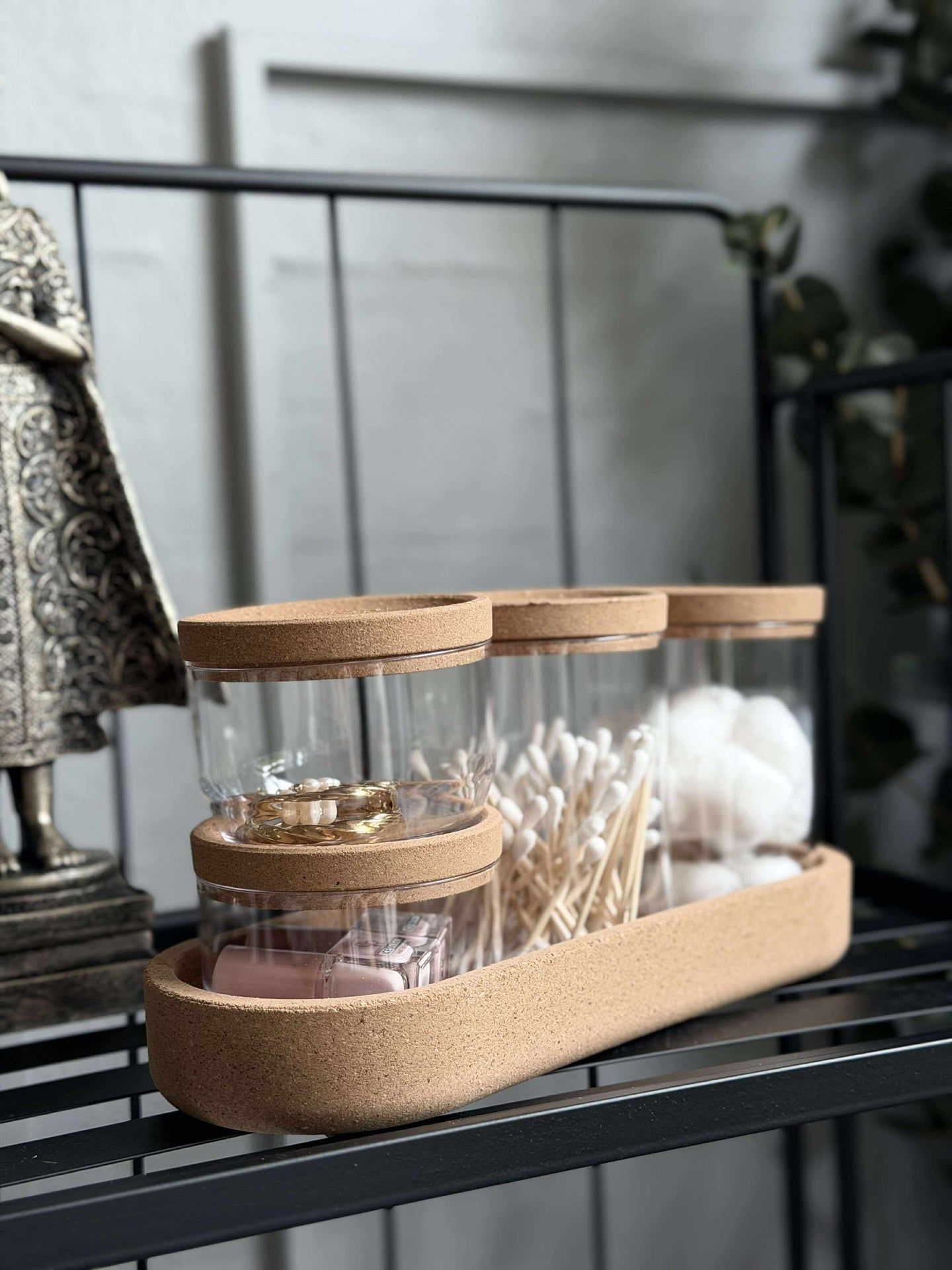Organisatorsettet kombinerer kork og plast, noe som gir en smart og praktisk oppbevaringsløsning. Korkens naturlige tekstur og varme toner skaper en innbydende atmosfære, mens plastens holdbarhet sikrer langvarig bruk. Sammen gir disse materialene en balanse mellom estetikk og funksjonalitet, noe som gjør det enkelt å holde orden uten å ofre stil.