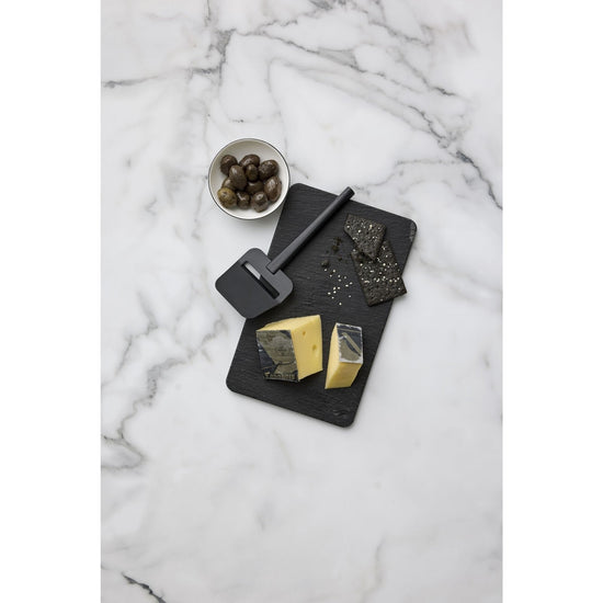 En svart Rosti ostehøvel i Emma-serien fra Rosti, som er laget for faste oster. Det brede bladet med skarpt skjær gjør det enkelt å skjære jevne skiver når du dekker frokostbordet eller serverer tapas.