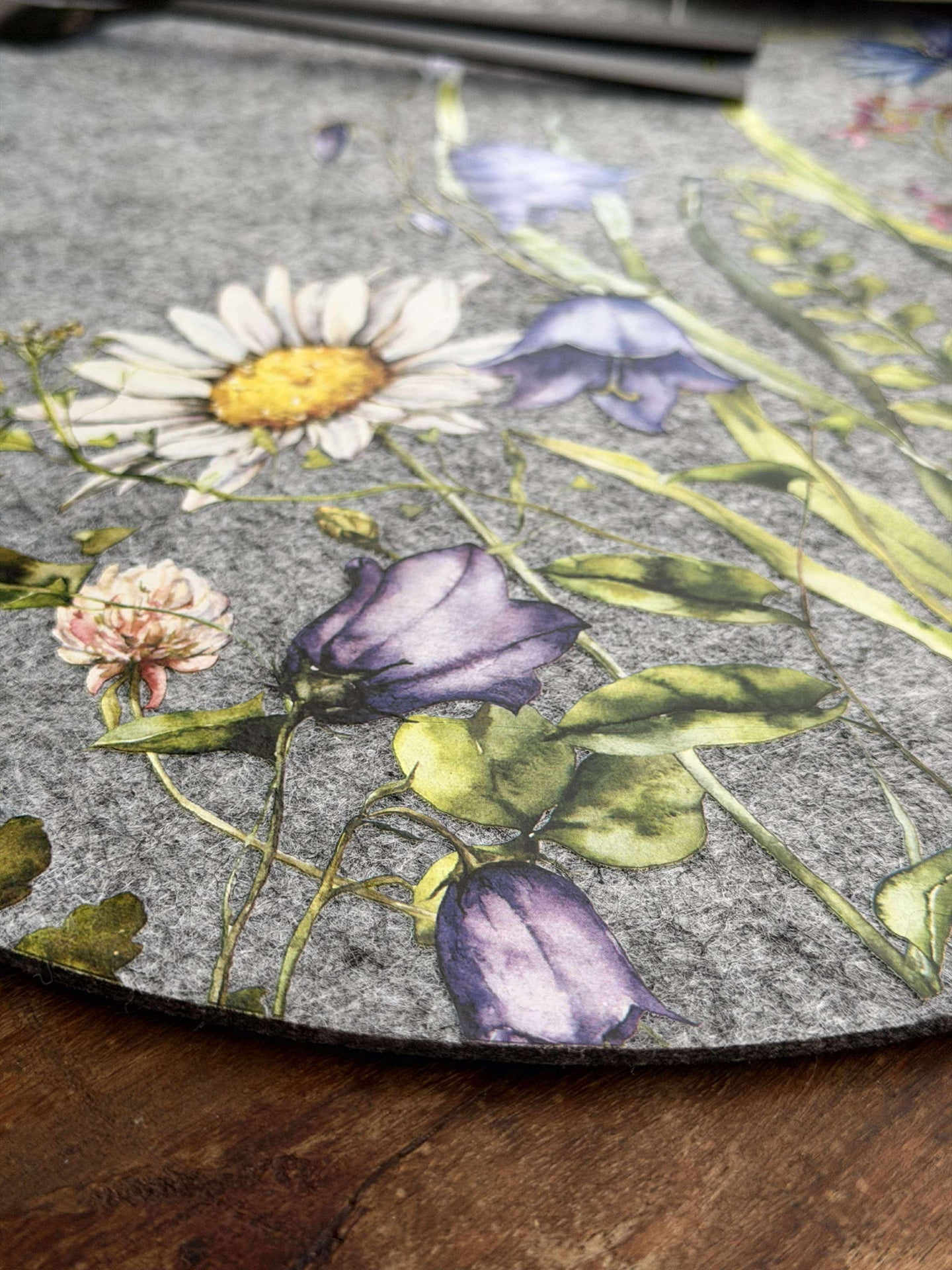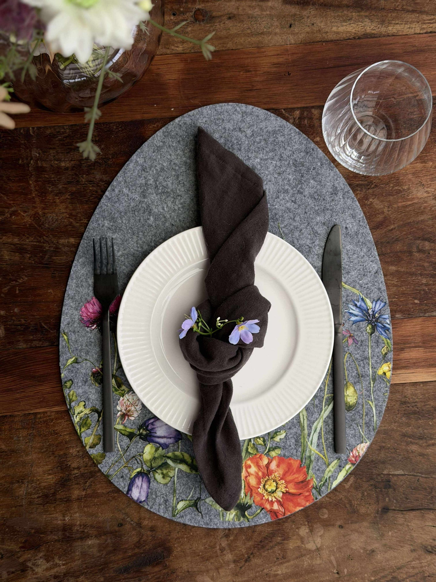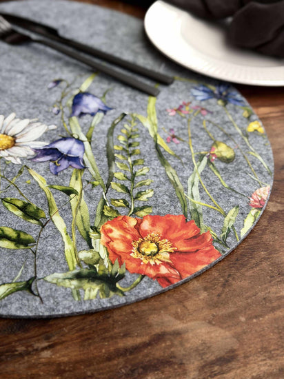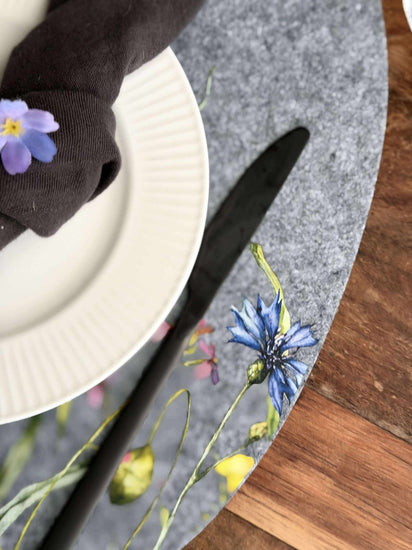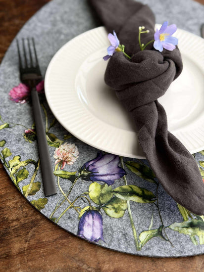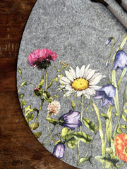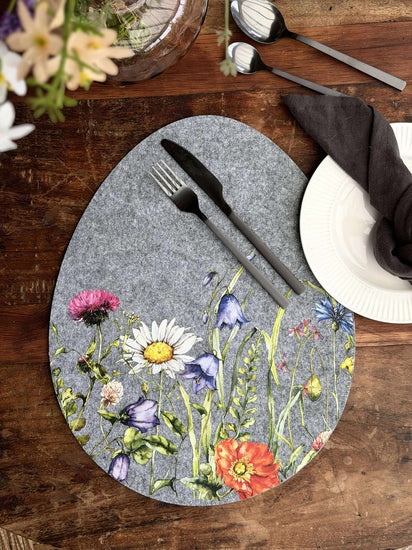 Dekkebrikke påske - Grå oval er en dekorativ dekkebrikke i filt, som gir borddekningen et rolig, nordisk uttrykk. Den grå fargen kombinert med et blomstrete mønster passer godt både til en enkel og en mer pyntet påskeborddekking.
