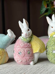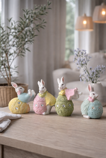En søt liten påskehare med egg, som gir et fint, lekent uttrykk i påskepynten din. Figuren selges assortert, så du får én av fire forskjellige varianter – valgt tilfeldig.