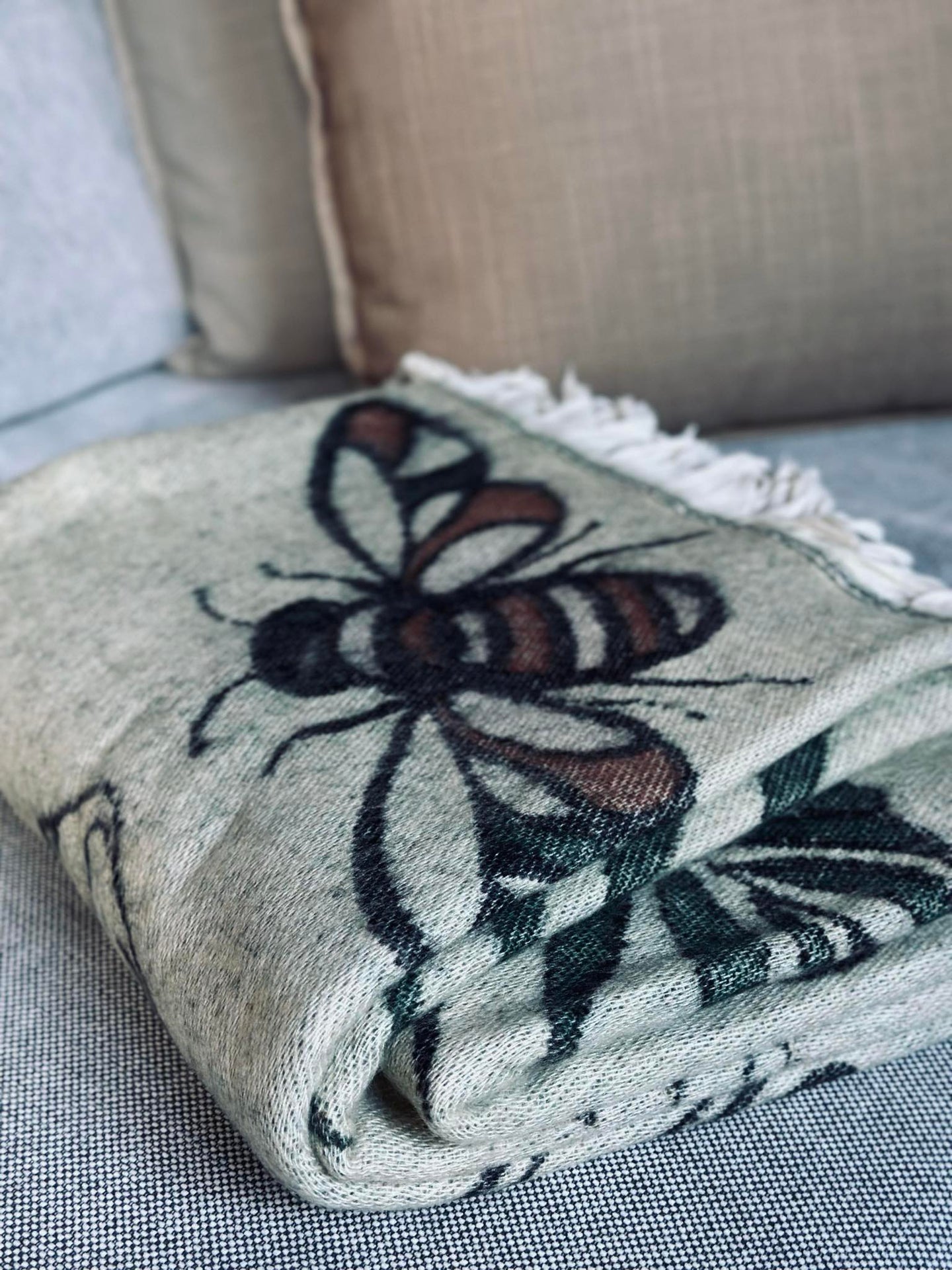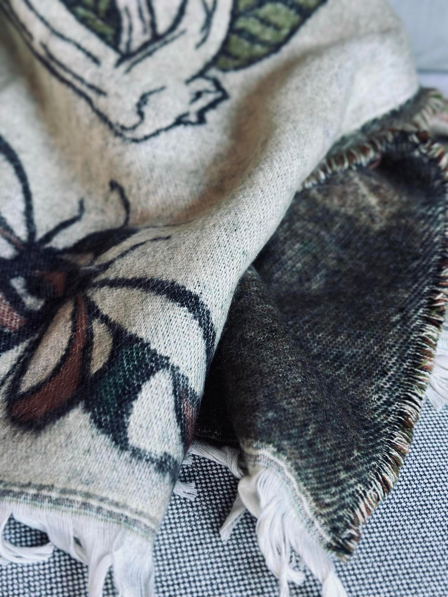 Pleddet har et trykk med fine detaljer i fargene Mushroom grønn og natur. Materialet er akryl/ull 15%.