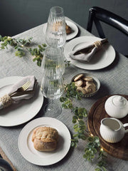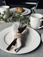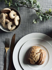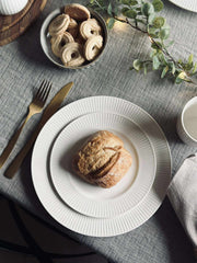Riflet tallerken er en hvid tallerken i porselen med riller, som giver borddækningen et roligt og struktureret udtryk. Den riflete overfladen tilfører en diskret detalje, som fungerer både til hverdag og når du dækker lidt mere op. Tallerkenen er lavet i New Bone China porcelæn.
