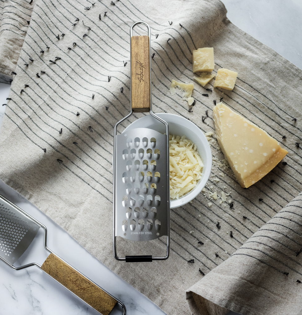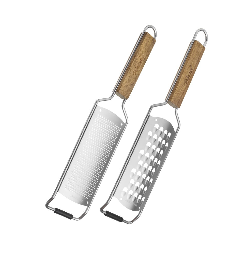 Håndtakene på rivejernet er laget av ekte akasie, noe som gir et naturlig og varmt preg til kjøkkenutstyret. Akasie er kjent for sin holdbarhet, noe som sikrer en lang levetid for produktet. Det ergonomiske designet av håndtakene gir et komfortabelt grep, slik at du kan rive ingredienser med mindre anstrengelse. Materialets naturlige egenskaper gjør det også motstandsdyktig mot fuktighet, noe som er ideelt for bruk i kjøkkenmiljøer.