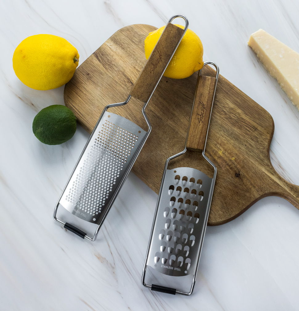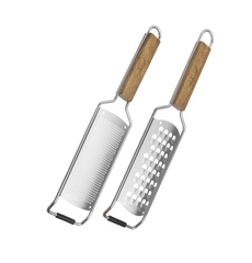 Unngå frustrasjonen med ujevne revne resultater på kjøkkenet. Dette 2-paknings rivejernsettet gir deg fleksibilitet med ulik grovhet, slik at du enkelt kan håndtere forskjellige ingredienser. Praktiske trehåndtak gir deg komfort og bedre kontroll under matlagingen.