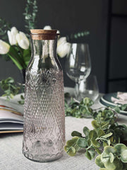 - Mønstret, transparent glasskaraffel i svak rosa