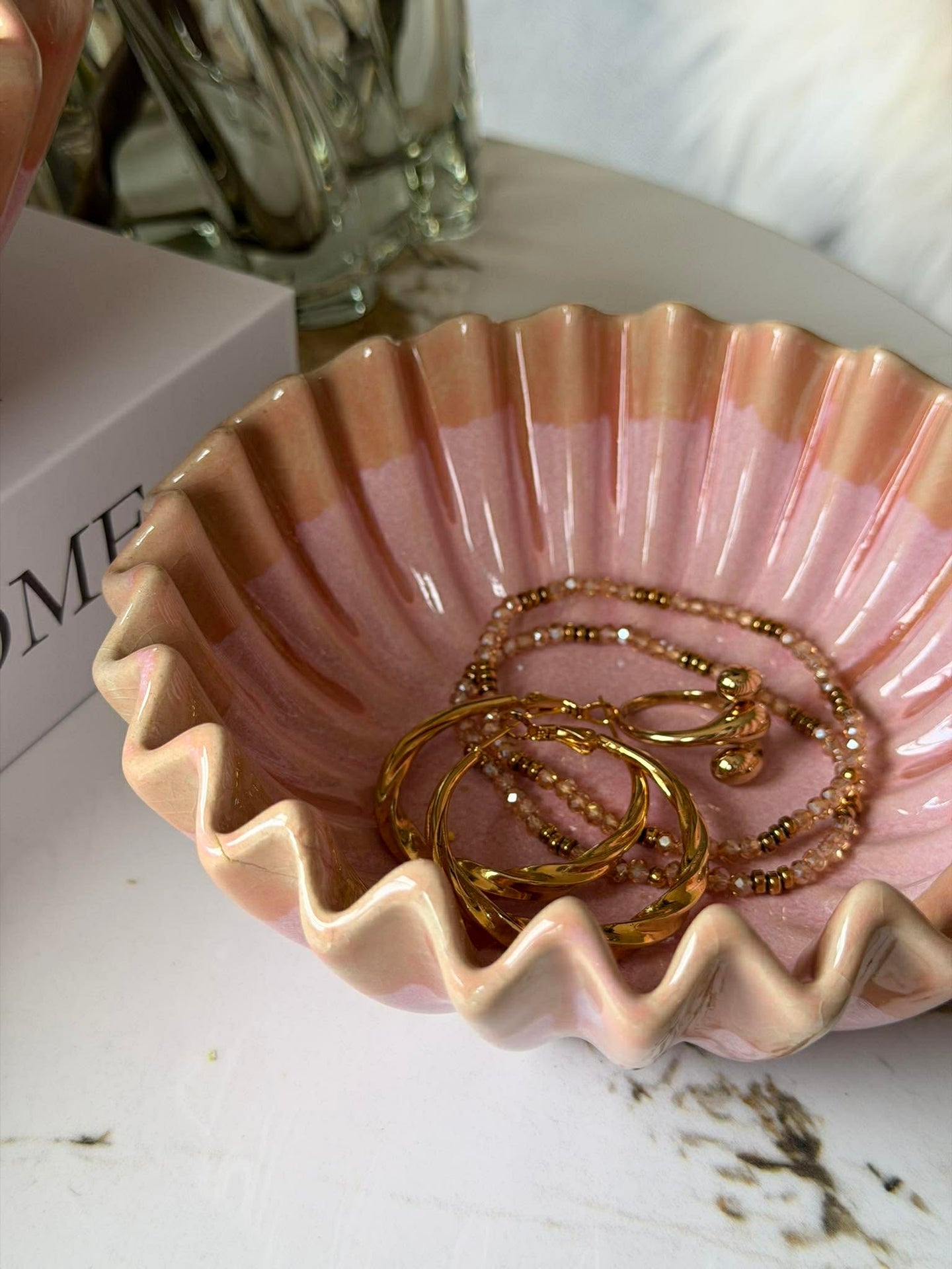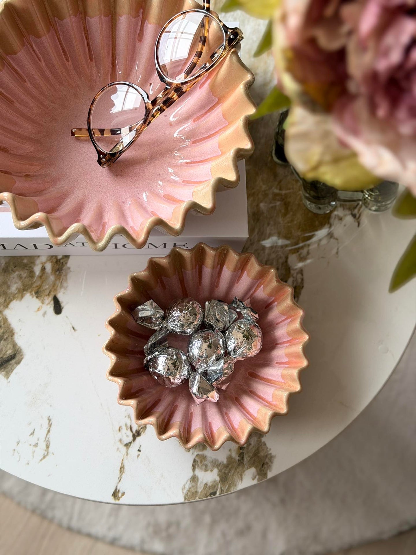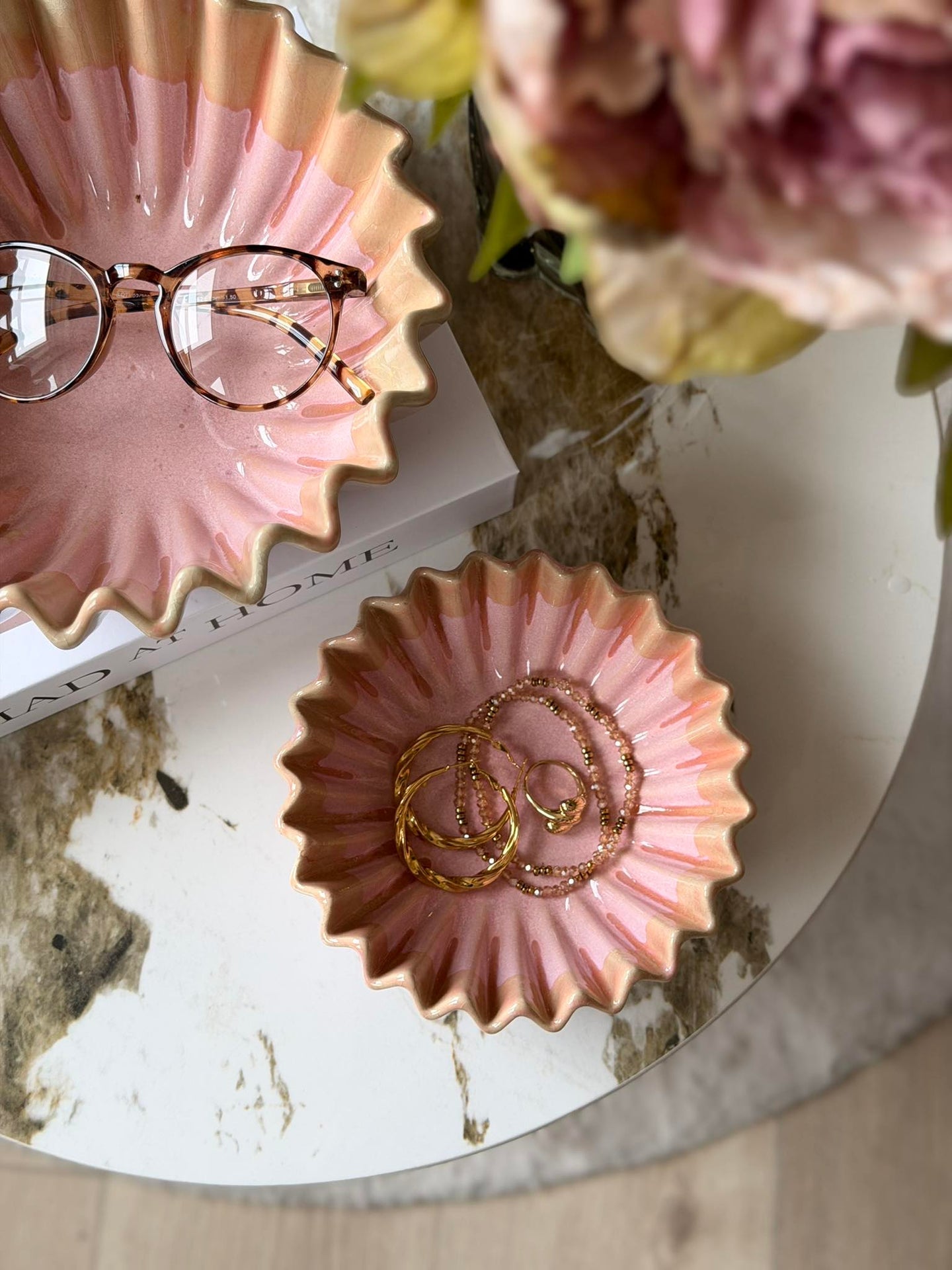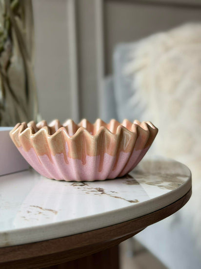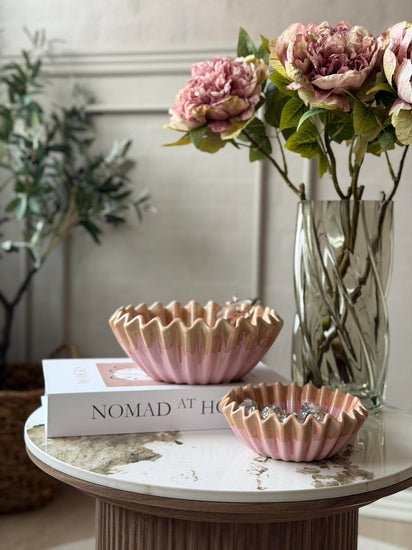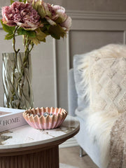Rosa skål Plissé - Flere størrelser er en dekorativ skål i keramikk med en plissé-inspirert overflate og et mykt, rosa uttrykk. Den rillede overflaten gir skålen et skulpturelt preg, som fungerer godt som en del av innredningen.
