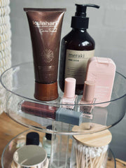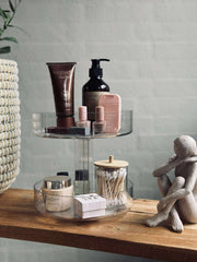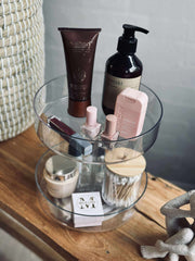 Den runde formen fungerer godt som et sminkestativ på bordet, når du vil samle tingene dine ett sted og samtidig ha et rolig, ryddig uttrykk. Den kan også brukes som roterende oppbevaring til småting du ønsker lett tilgjengelig.