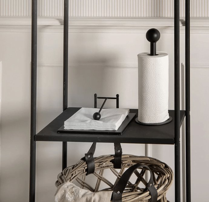 Serviettholderen er laget av svart metall, noe som gir den en robust og holdbar struktur. Materialet sikrer stabilitet, slik at serviettene holdes pent på plass, samtidig som det er enkelt å rengjøre og vedlikeholde. Det svarte metallet tilfører en moderne og stilig estetikk som kan komplementere en rekke interiørstiler, fra minimalistisk til industrielt.
