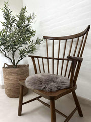 Et rundt sittefell i ekte, moccafarget lammeskinn, som tilfører et mykt og innbydende uttrykk. Skinnet er farget og har en deilig, myk kvalitet som gjør det behagelig å bruke i hverdagen.