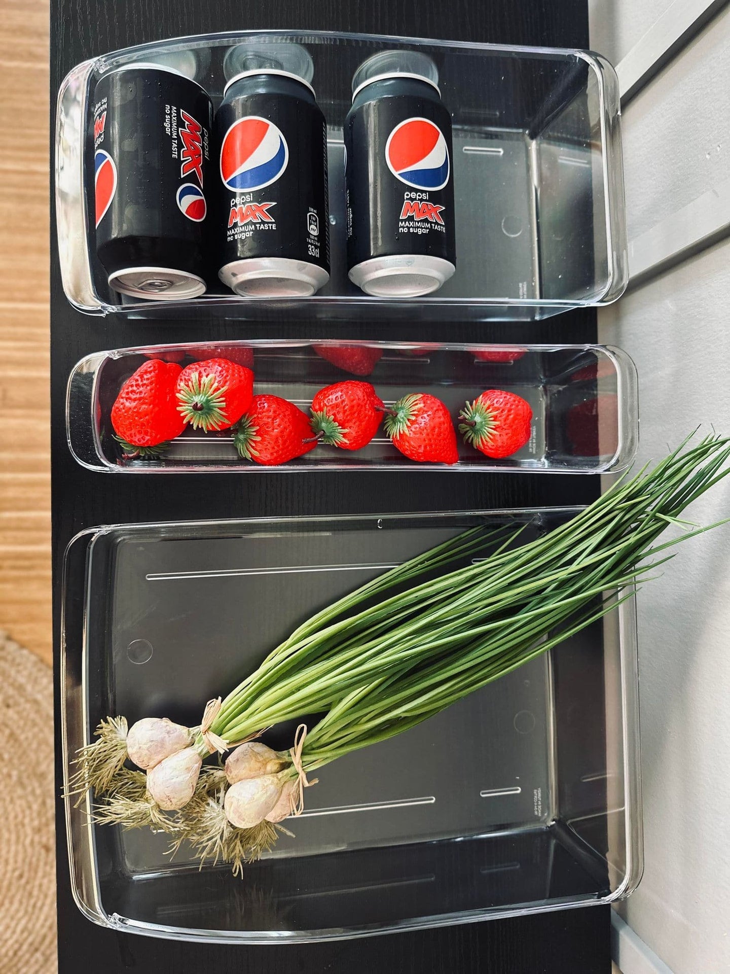 Få kontroll over kjøleskapets rot med settet av tre transparente bokser. De er ideelle for å organisere matvarer og gi enkel tilgang til det du trenger. Disse boksene hjelper deg med å holde kjøleskapet ryddig og oversiktlig uten stress.