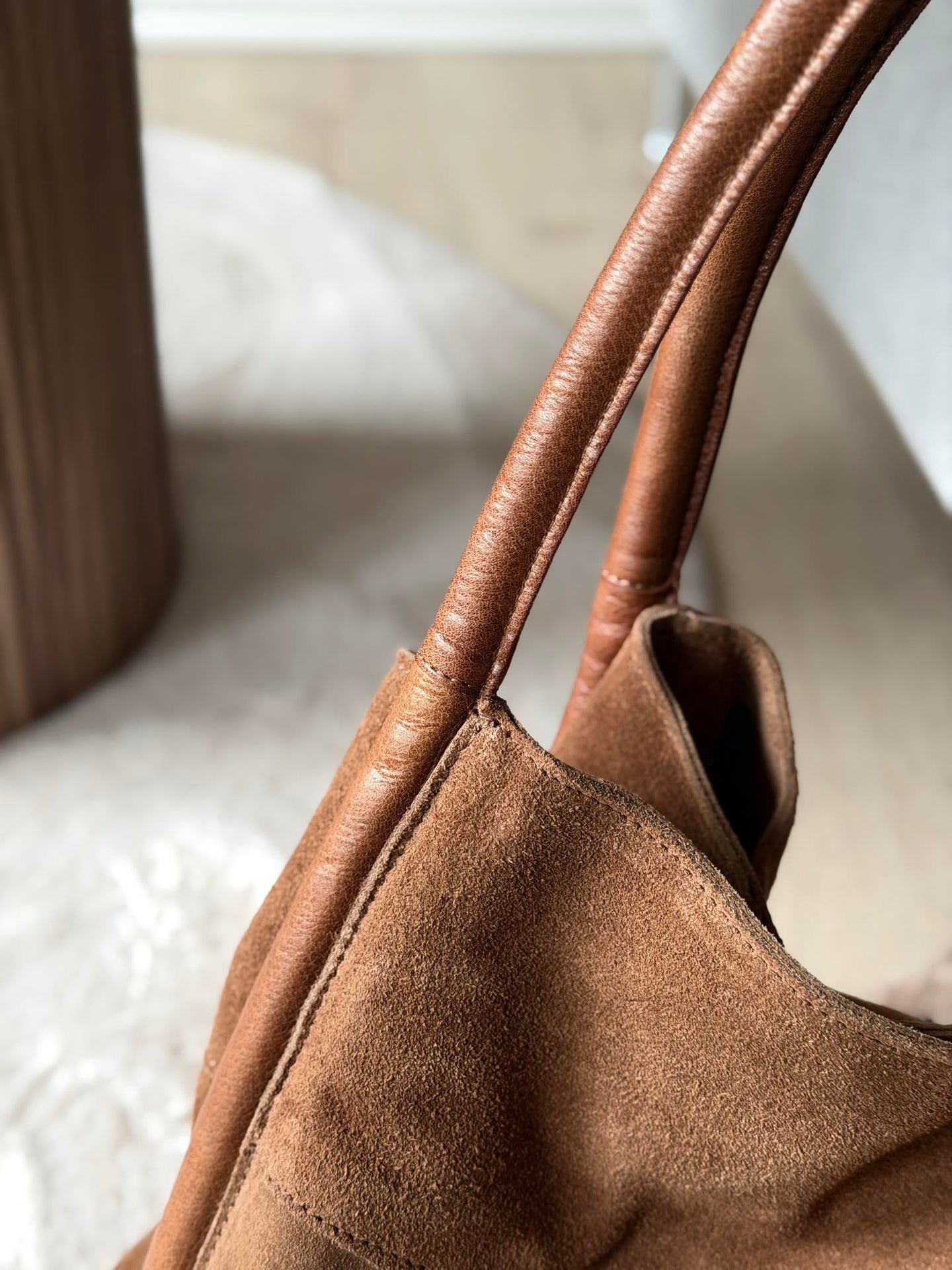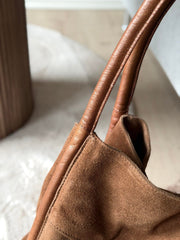 Meno er en stilfull shopper i mykt ruskinn i fargen Walnut, skapt for et enkelt og elegant hverdagslook. Den luksuriøse ruskinnsoverflaten gir vesken et varmt, naturlig uttrykk, mens skinnremmen tilfører en raffinert kontrast.