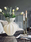Den matte, satinlignende finishen på glassvasen gir et mykt og behagelig utseende som passer inn i ulike interiørstiler. Denne spesielle overflaten demper lysrefleksjoner, noe som skaper en rolig og harmonisk atmosfære i rommet. Finishen fremhever også vasens form og farge, og gir en subtil eleganse som kan komplementere både blomsteroppsatser og minimalistiske dekorasjoner.