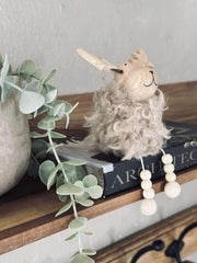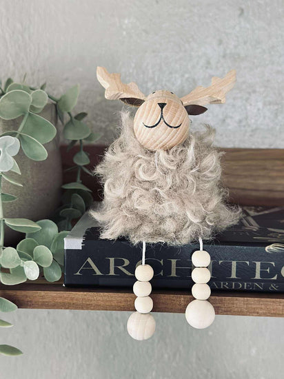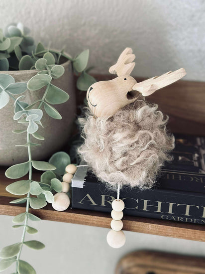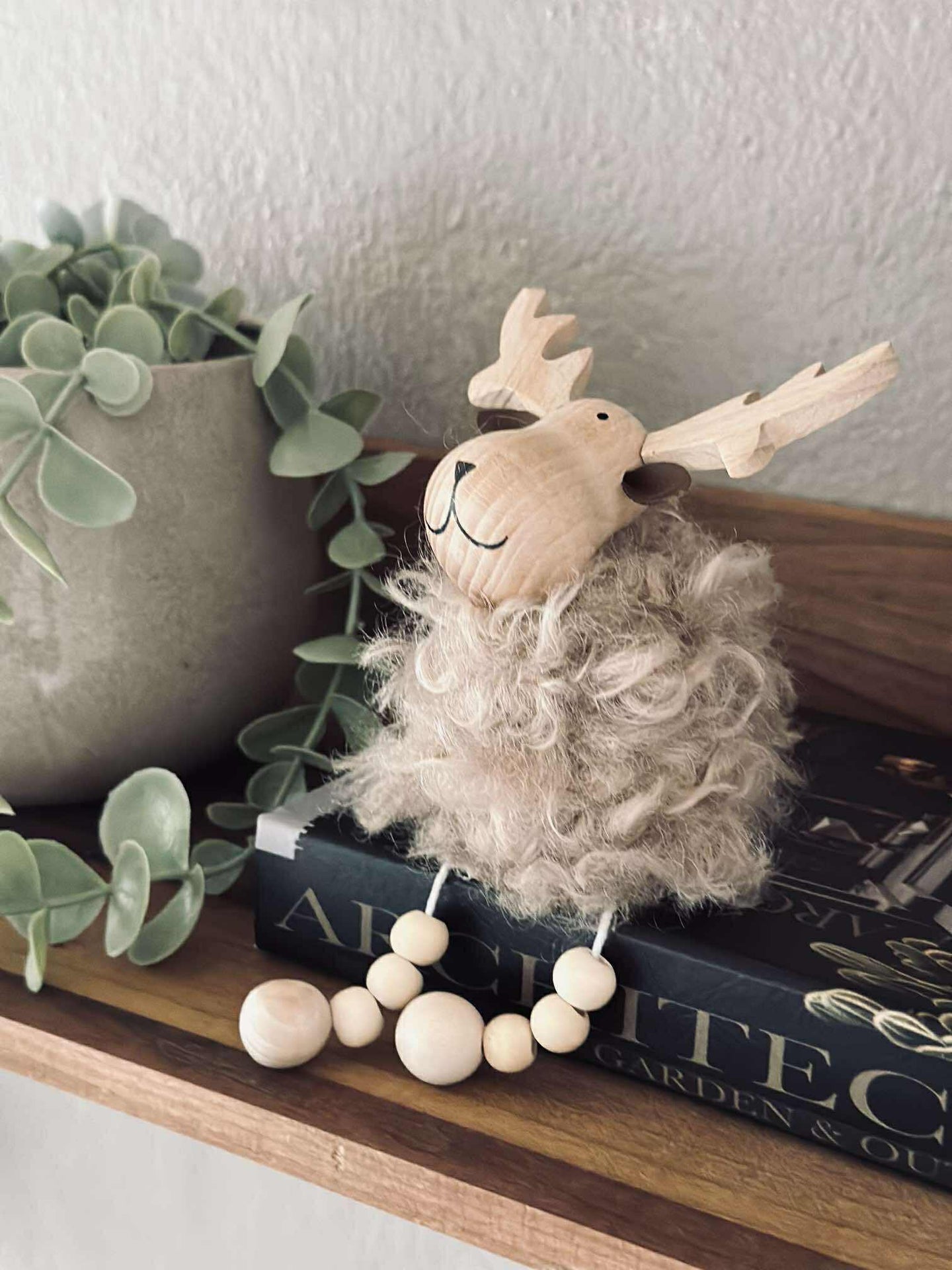 Den dekorative elgen, skåret ut av massiv bøk, gir en naturlig og varm følelse til ethvert rom. Bøkens holdbarhet sikrer at elgen beholder sin form og struktur over tid, noe som gjør den til et pålitelig tillegg til interiøret. Det solide materialet gir en følelse av tyngde og kvalitet, samtidig som det tilfører en naturlig tekstur som komplementerer ulike stiler.
