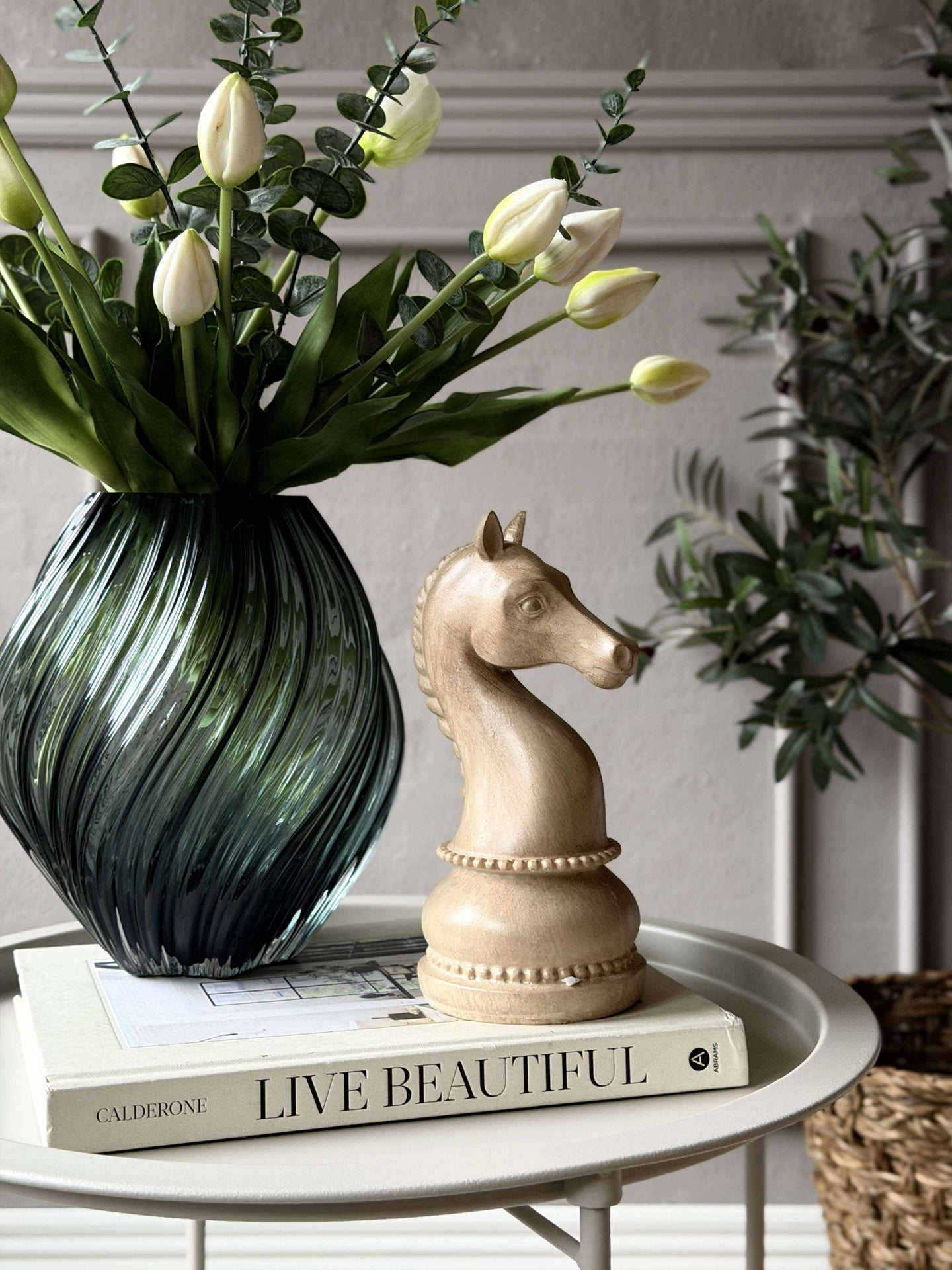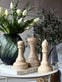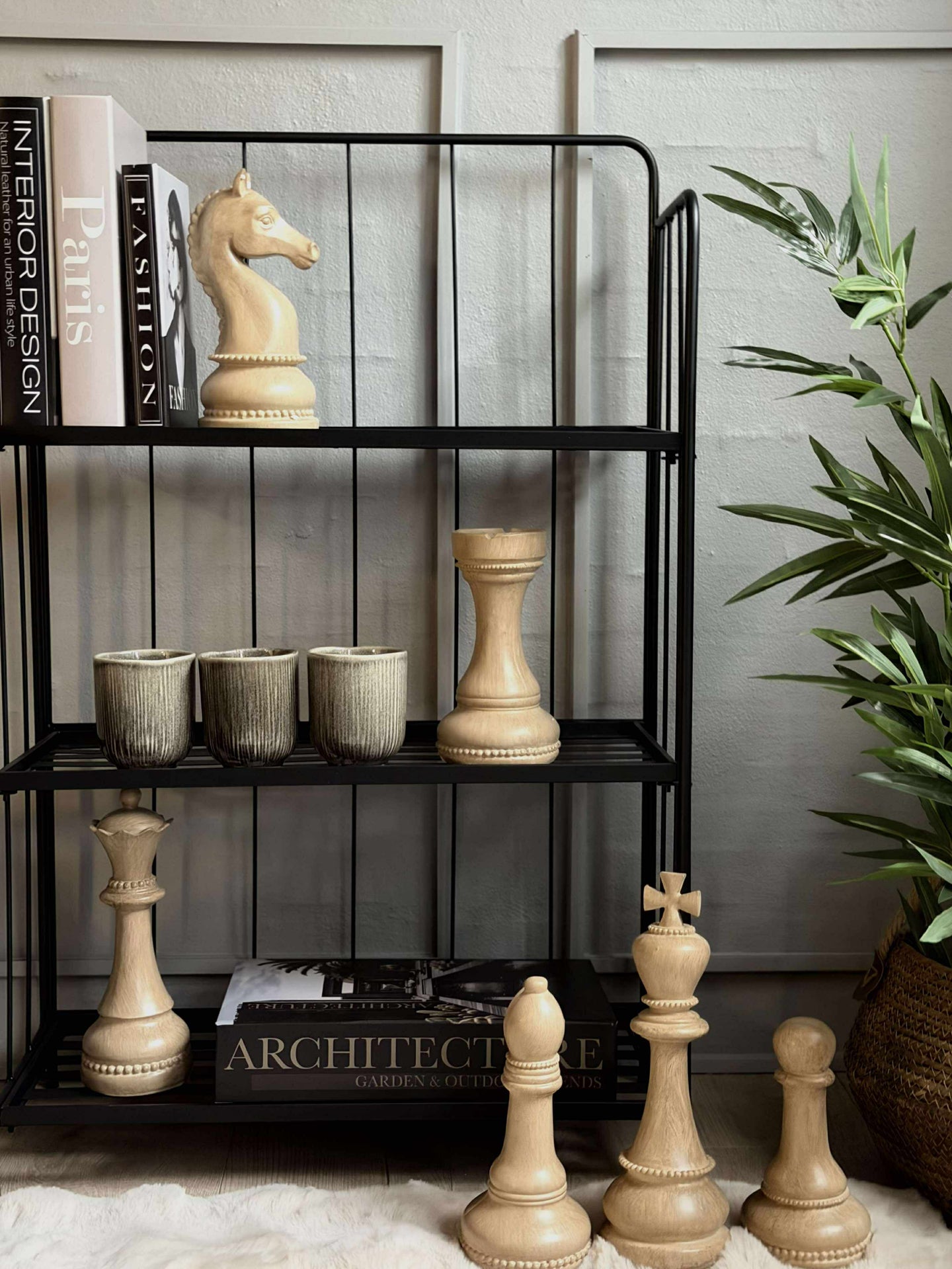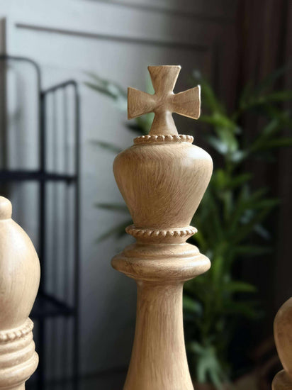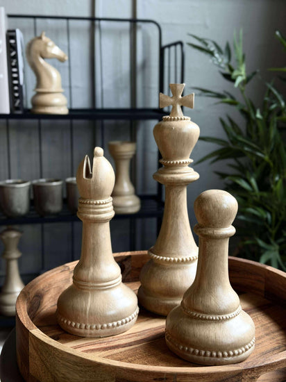 Sjakkbrikkene er laget av polystone, et materiale kjent for sin holdbarhet og detaljerte finish. Dette gir brikkene en solid følelse og gjør dem motstandsdyktige mot slitasje, samtidig som de bevarer sitt estetiske uttrykk over tid. Med sin tyngde og tekstur tilfører polystone-brikkene en subtil vekt til rommet, noe som kan bidra til en følelse av balanse og ro i interiøret.