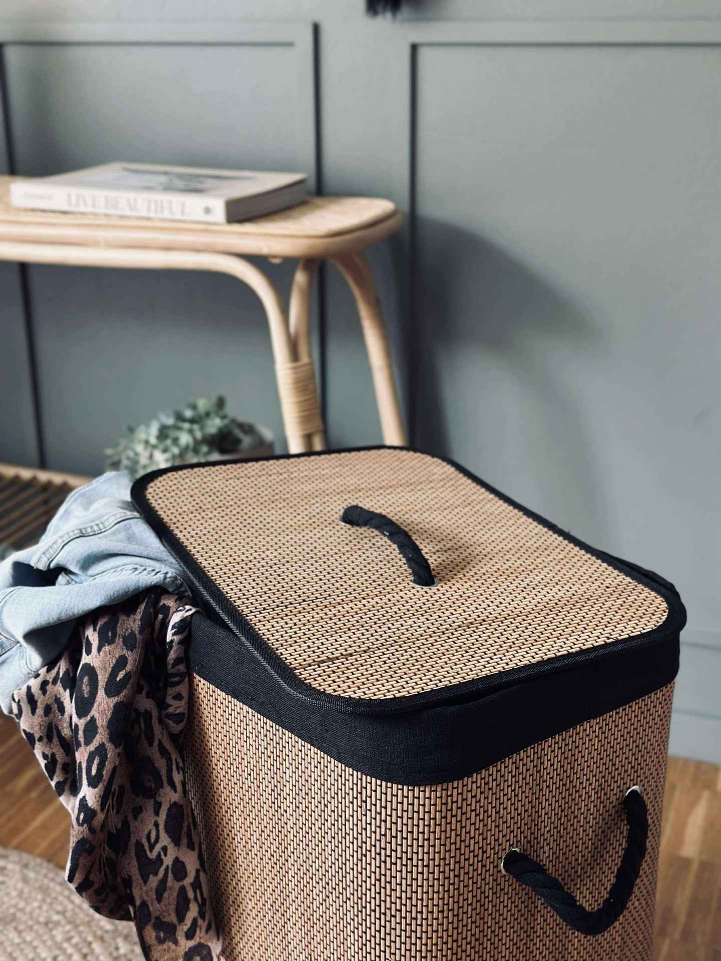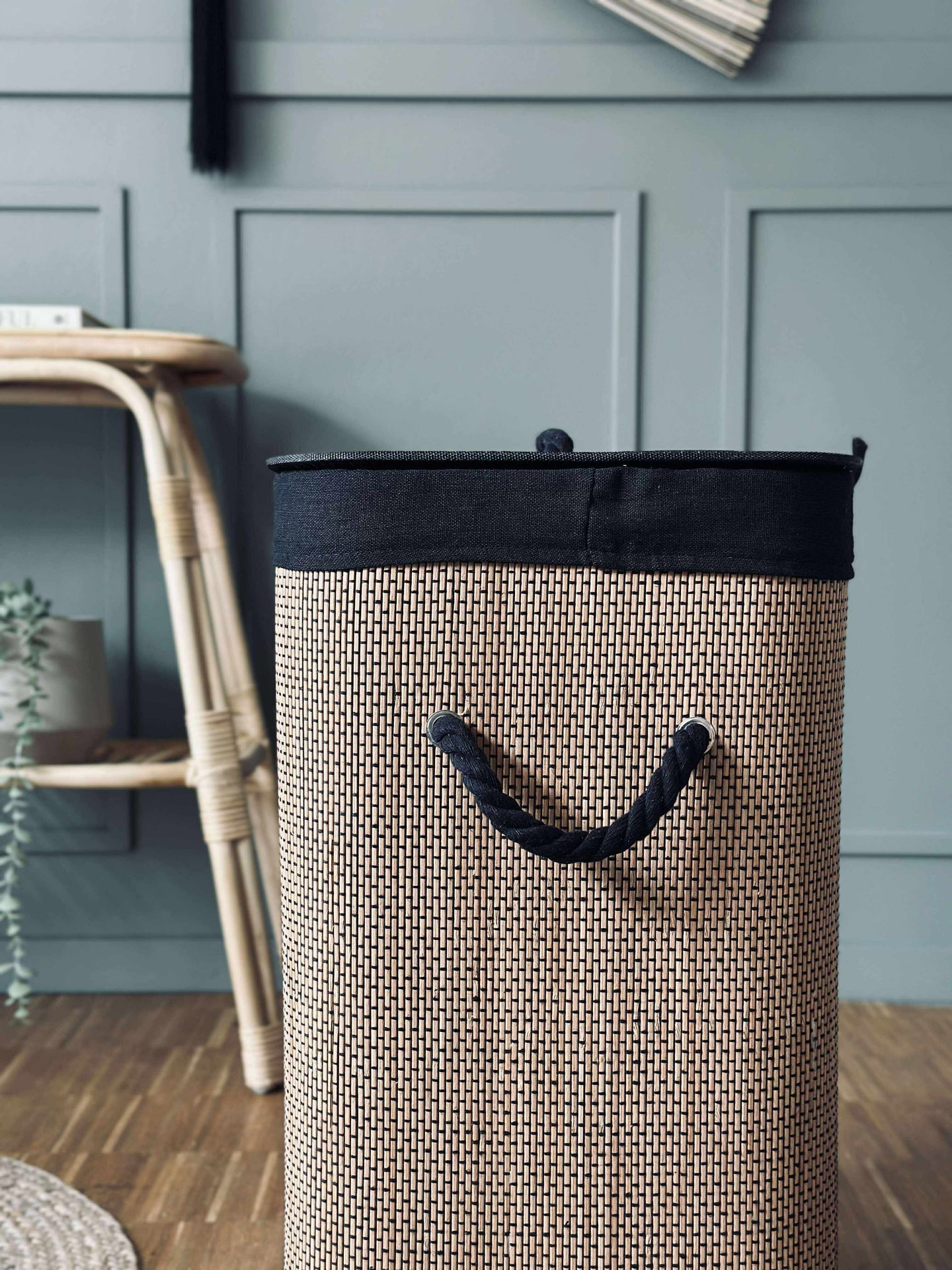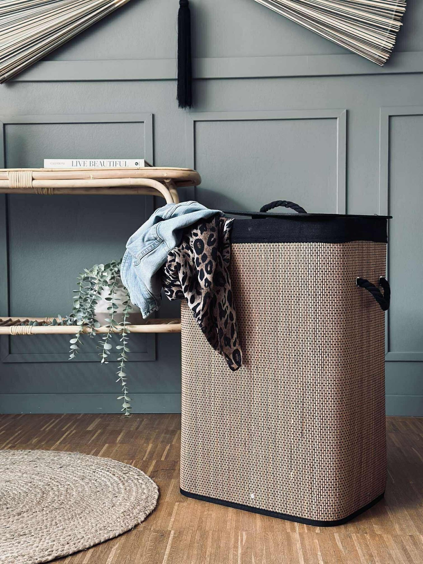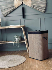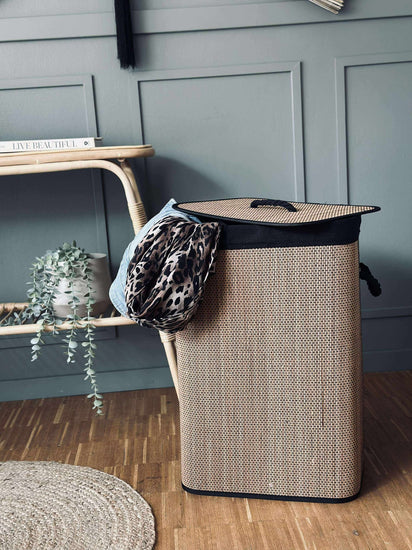 Vasketøyskurven, laget av ekte bambus, kombinerer funksjonalitet med miljøvennlighet. Bambus er et naturlig, fornybart materiale som gir kurven en solid og holdbar struktur. Dette bidrar til å redusere plastbruken i hjemmet. I tillegg gir bambus et naturlig estetisk preg som passer godt inn i ulike interiørstiler, samtidig som det skaper en varm og innbydende atmosfære.