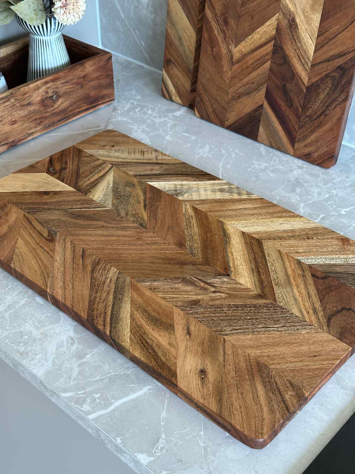 Skjærefjølen med sildebensmønster er laget av ekte akasietre, som gir en naturlig skjønnhet og holdbarhet til kjøkkenet ditt. Akasietre er kjent for sin motstandskraft mot fuktighet og slitasje, noe som gjør fjølen til et solid valg for daglig bruk. Den naturlige trestrukturen gir hver fjøl et unikt utseende, samtidig som den bevarer knivens skarphet under bruk.