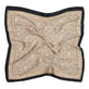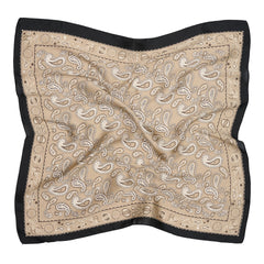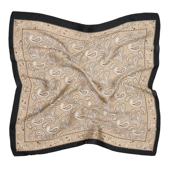 Materialet er polyester, og mønsteret er printet. Fargene holdes i beige med svarte detaljer, så skjerfet fremstår klassisk og moderne på samme tid.