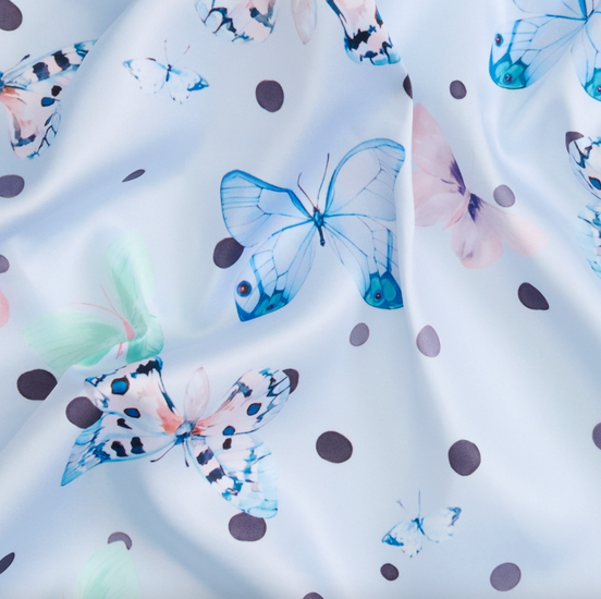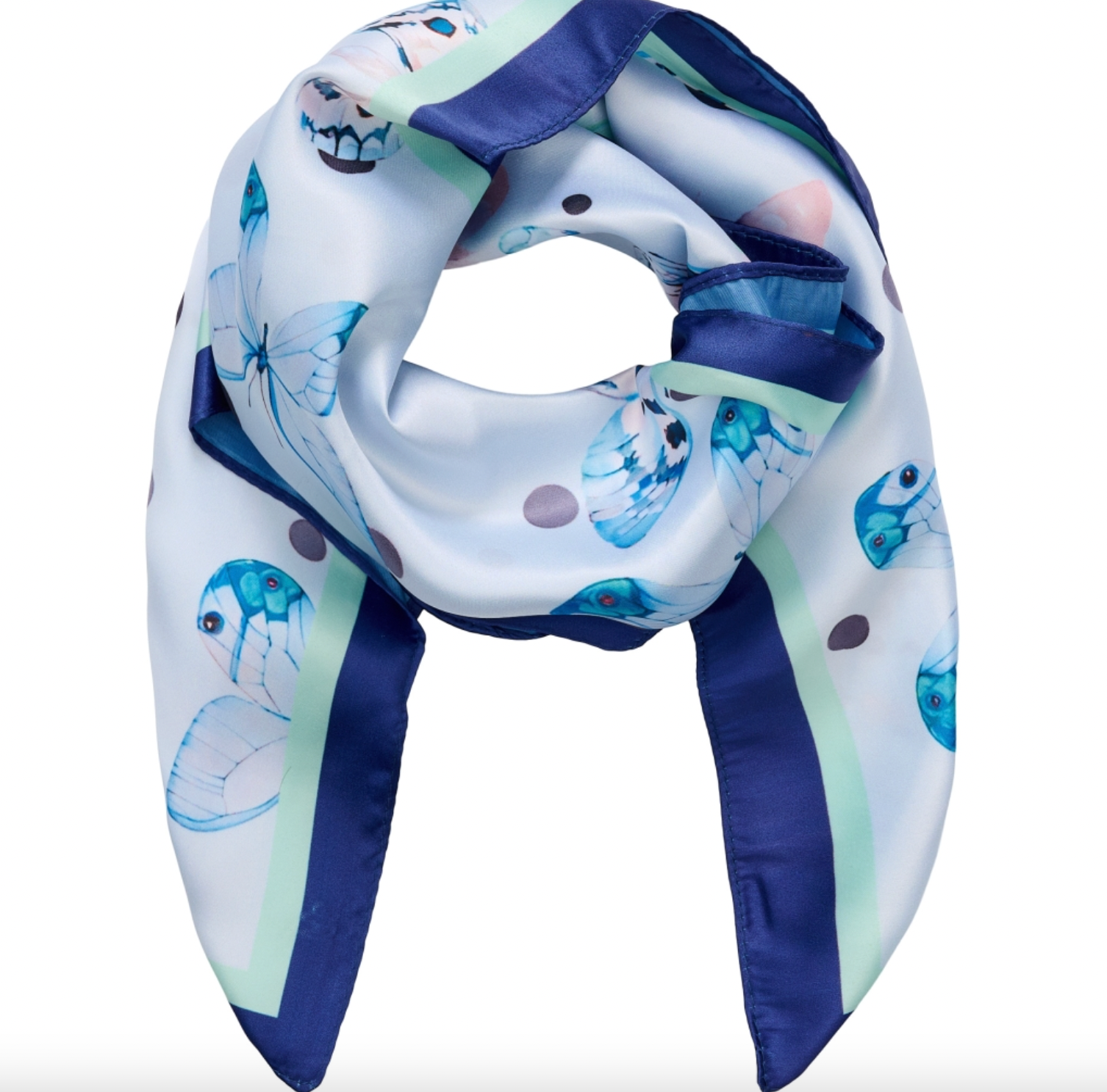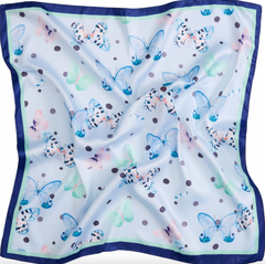 Skjerfet er laget i 100 % polyester. Det blå fargespillet kombinert med det trykte mønsteret skaper et levende uttrykk, der shine-detaljen tilfører en lett, elegant finish.