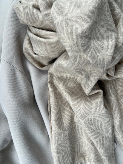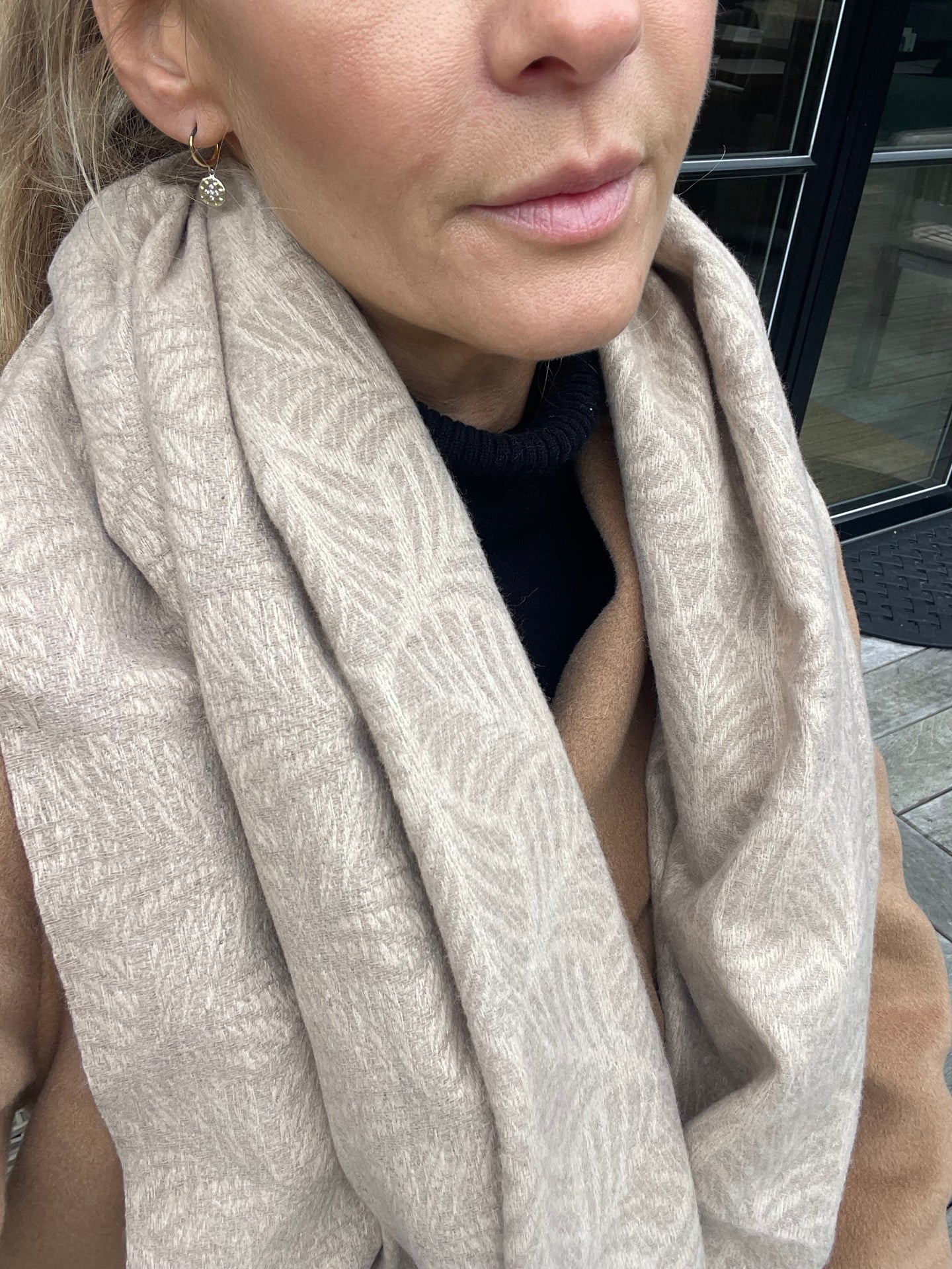 Skjerf Helena - Sand er et mykt skjerf i en rolig sandfarget nyanse. Det vevde uttrykket med struktur gir et fint, naturlig uttrykk som er lett å style til både hverdag og mer enkle, klassiske antrekk. Med sin generøse størrelse kan det brukes på flere måter – løst rundt halsen eller som et ekstra lag når dagene er kjølige.