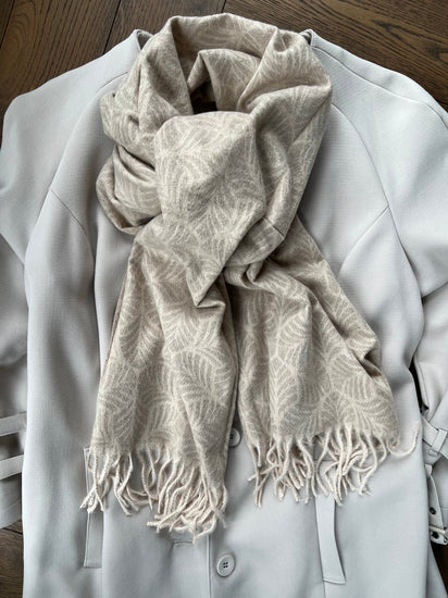 Skjerfet er laget i viskose og har et struktur/vevd mønster, som tilfører dybde til den ensfargede sandtonen.