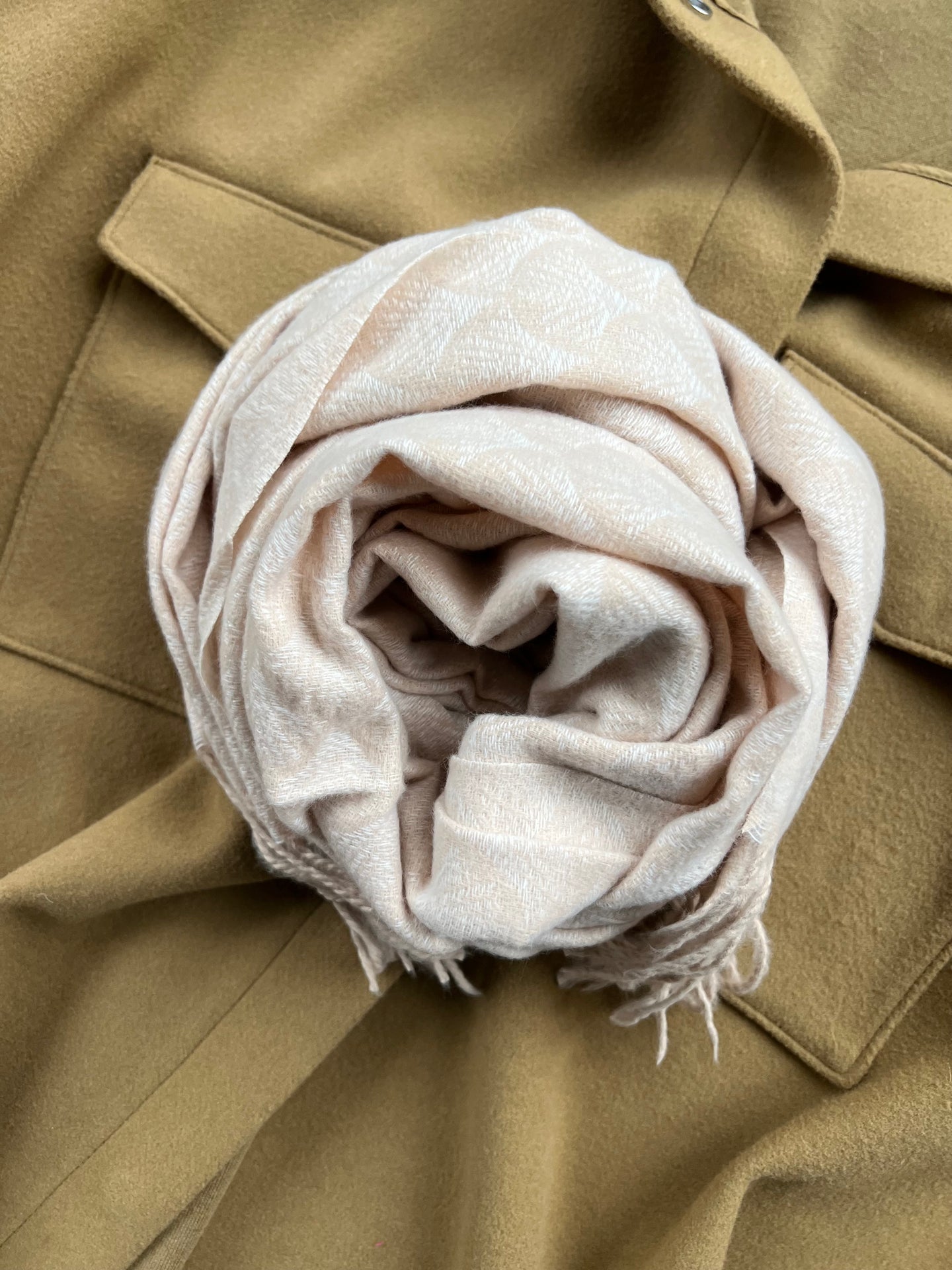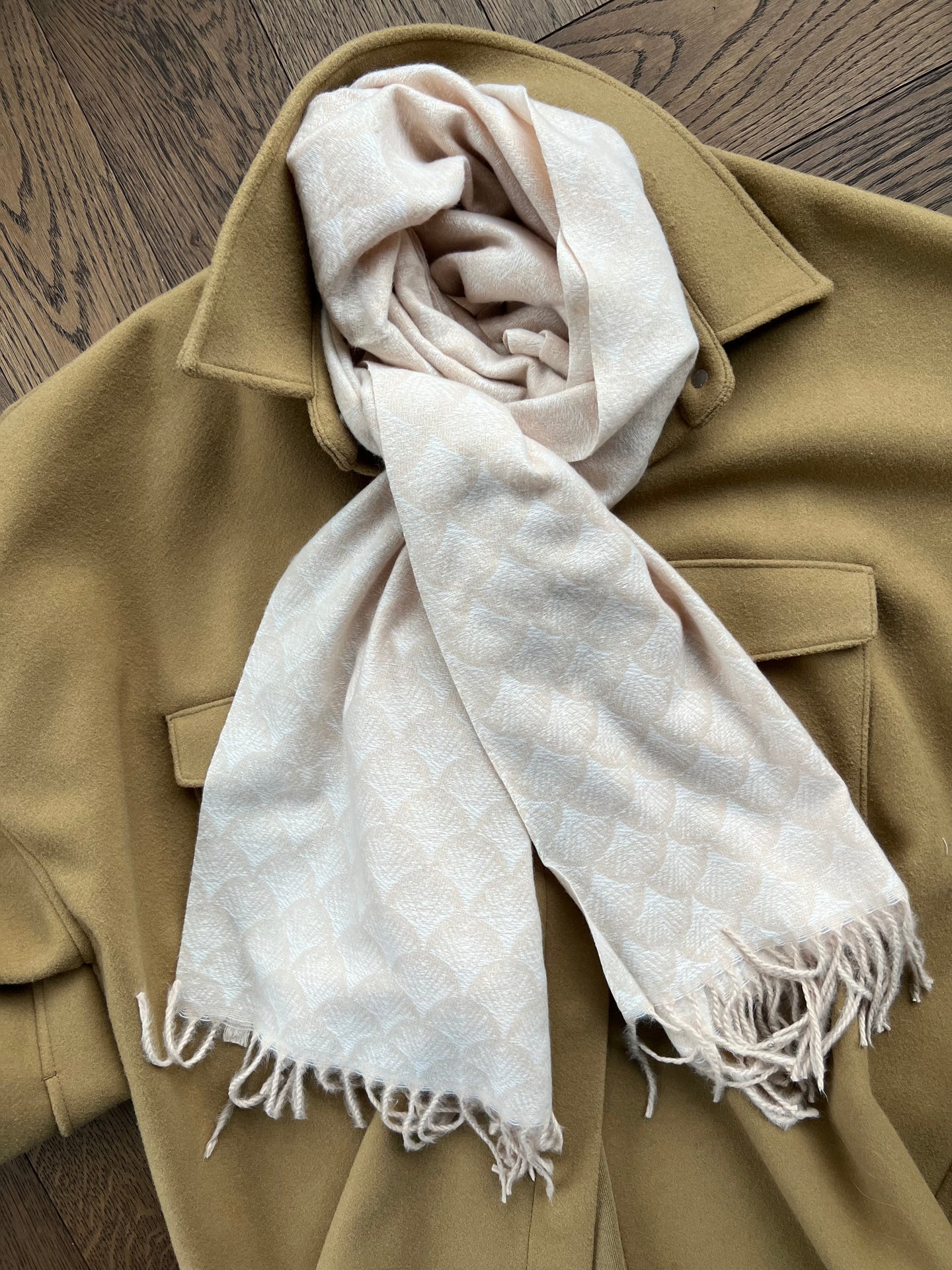 Skjerf Malene - Krem er et mykt og varmt skjerf for de kalde dagene. Det har et vevd, strukturert uttrykk, som gir et rolig uttrykk og en fin dybde i overflaten. Den kremfargede tonen er diskret og enkel å style til både lyse og mørke antrekk.