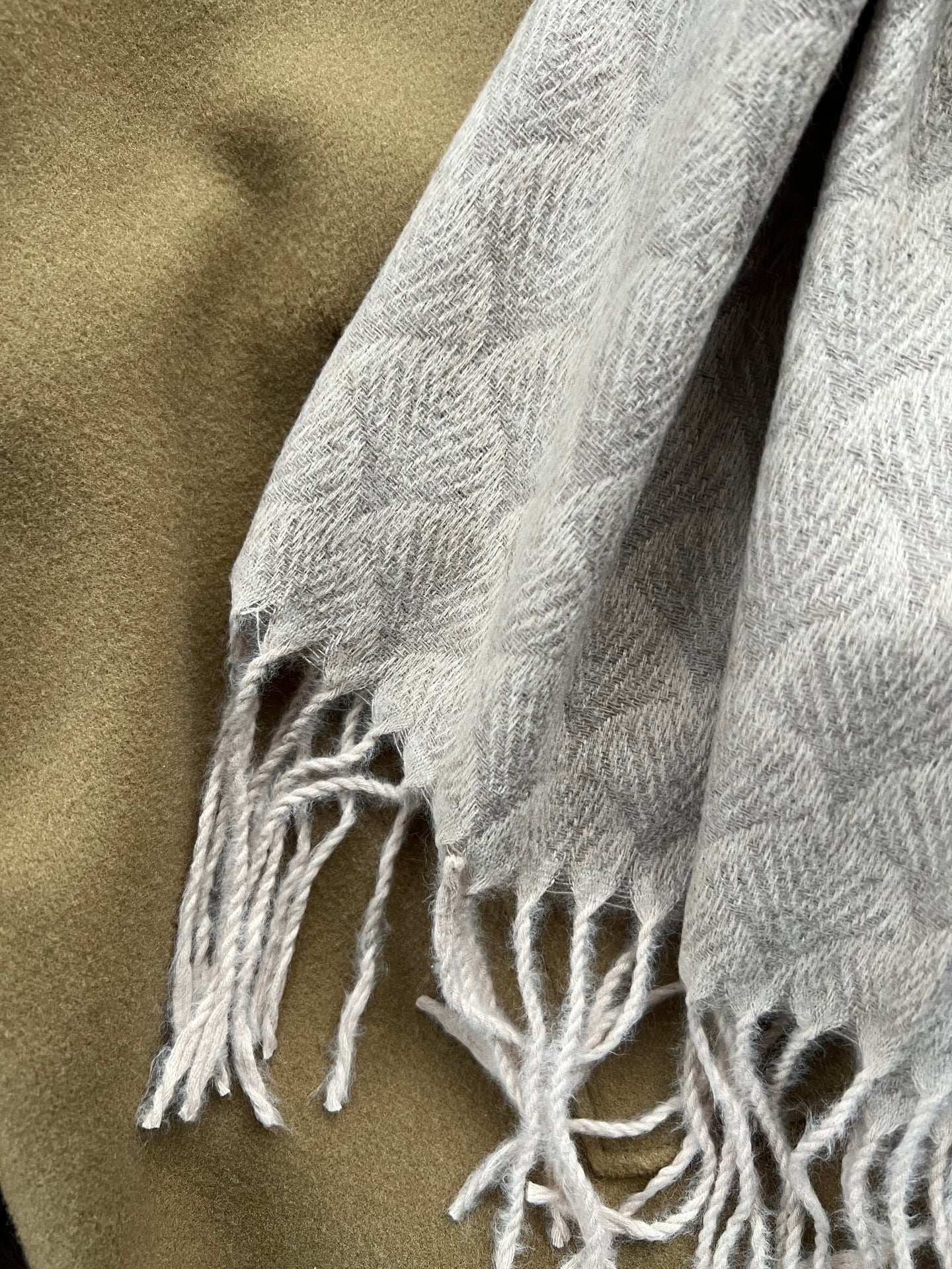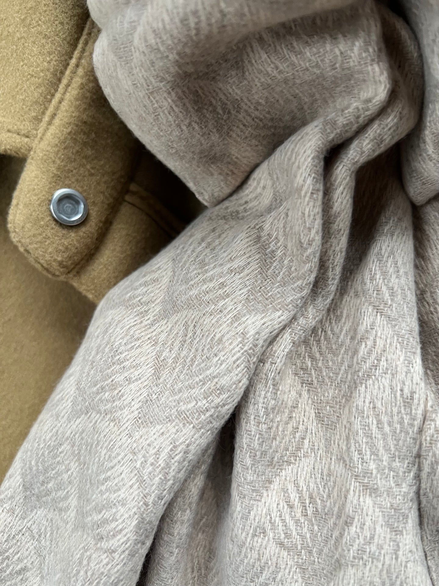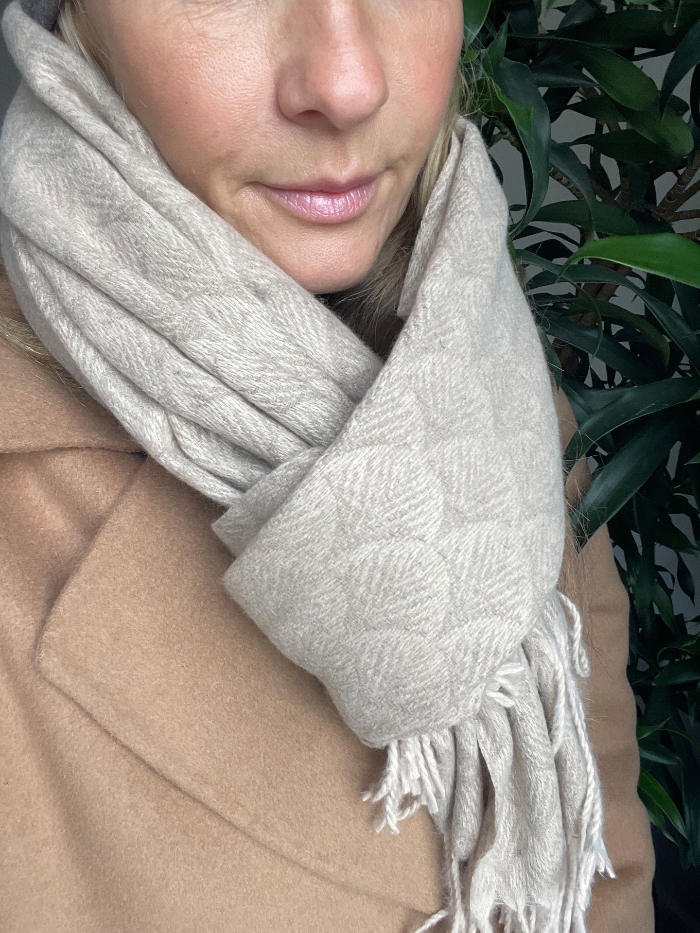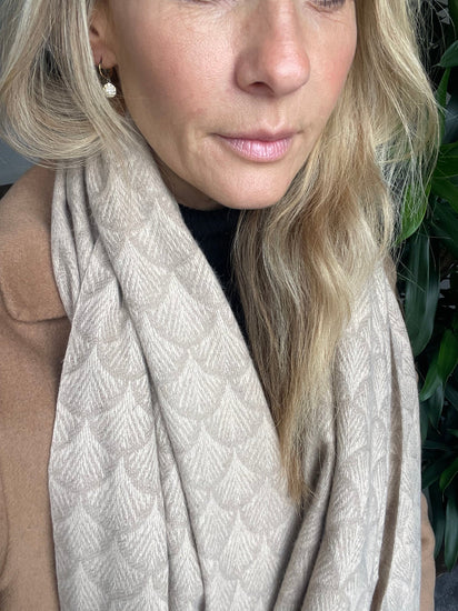 Bruk skjerfet som en myk avslutning på hverdagslooken, eller la den sandfargede tonen skape ro i et mer lag-på-lag antrekk.