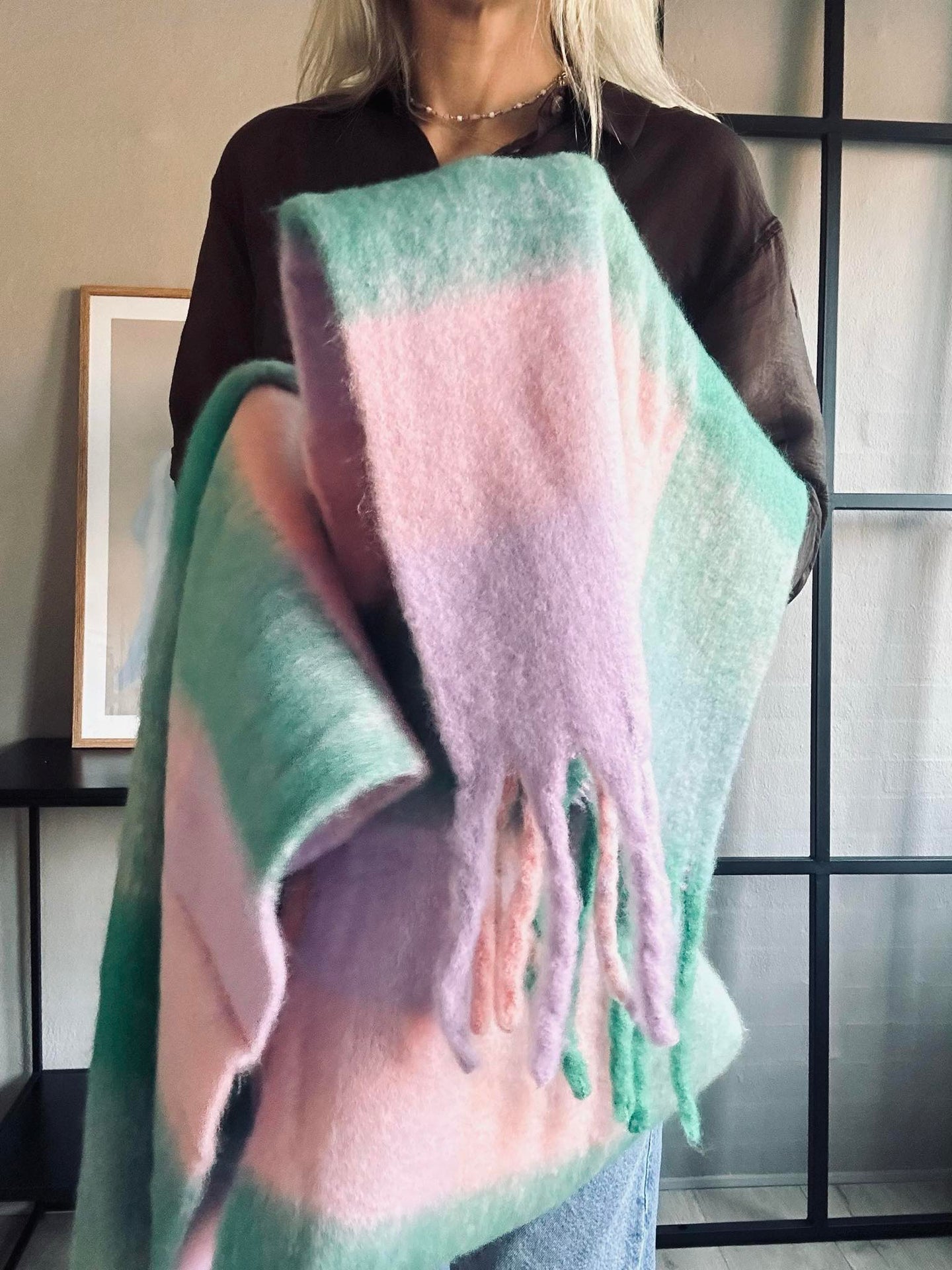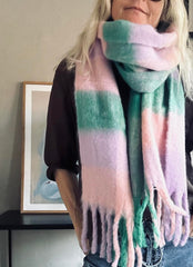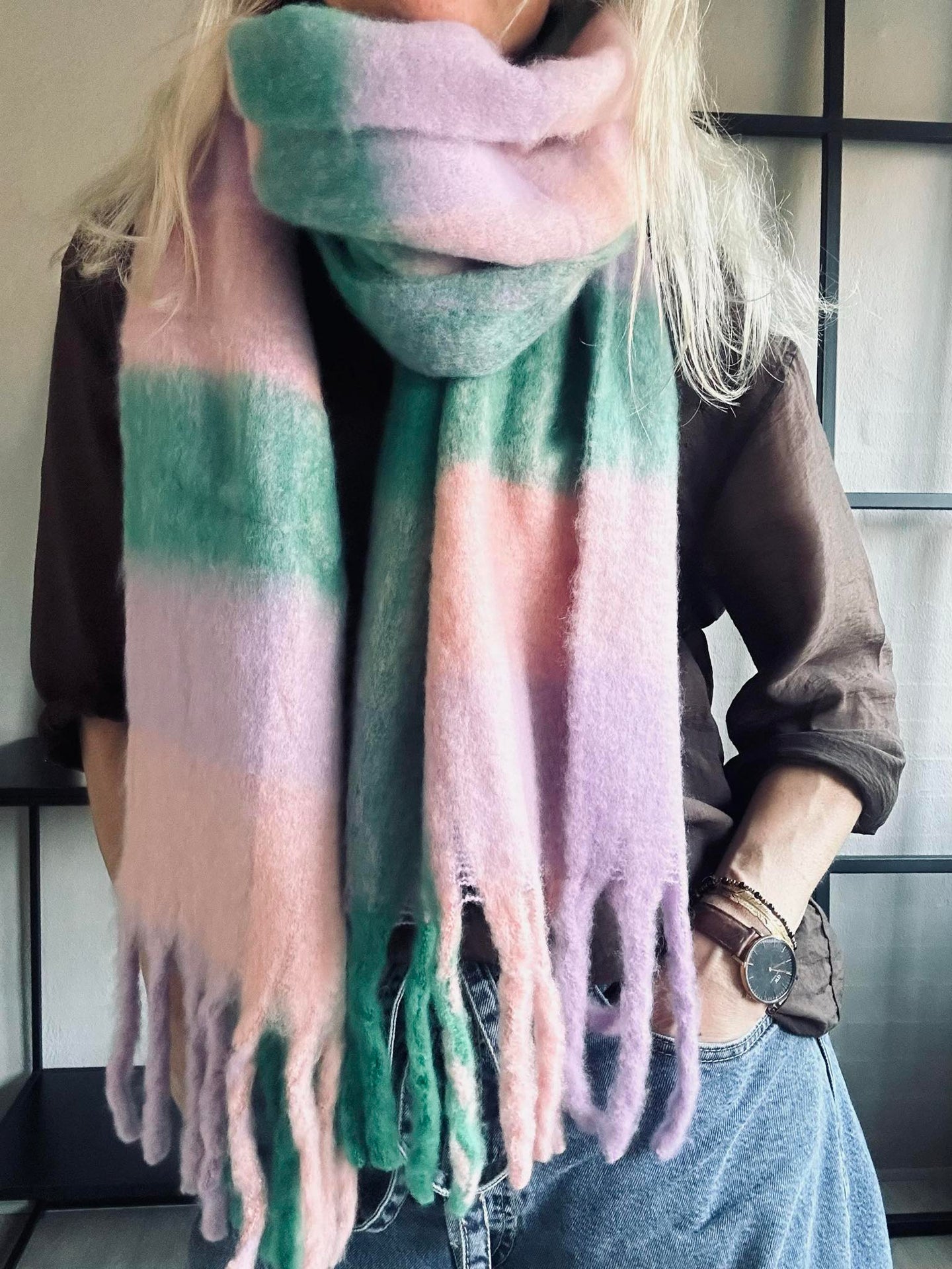 Skjerf Ninna - Rosa / grønn er et lunt og mykt skjerf med tydelige fargetoner i rosa og grønn. Det stripete mønsteret gir et rolig, dekorativt uttrykk, som er lett å kombinere med både nøytrale og fargerike antrekk.