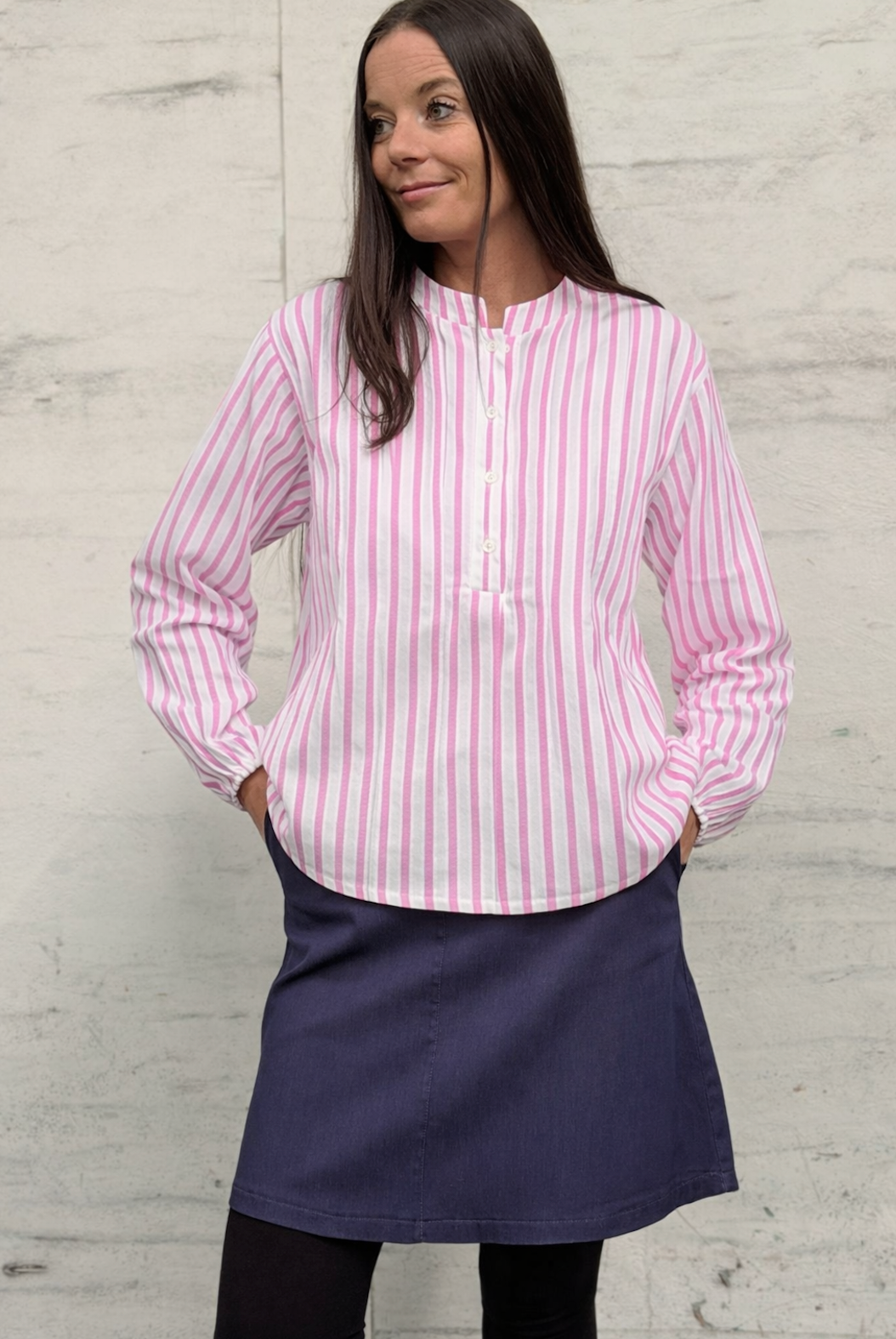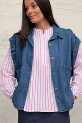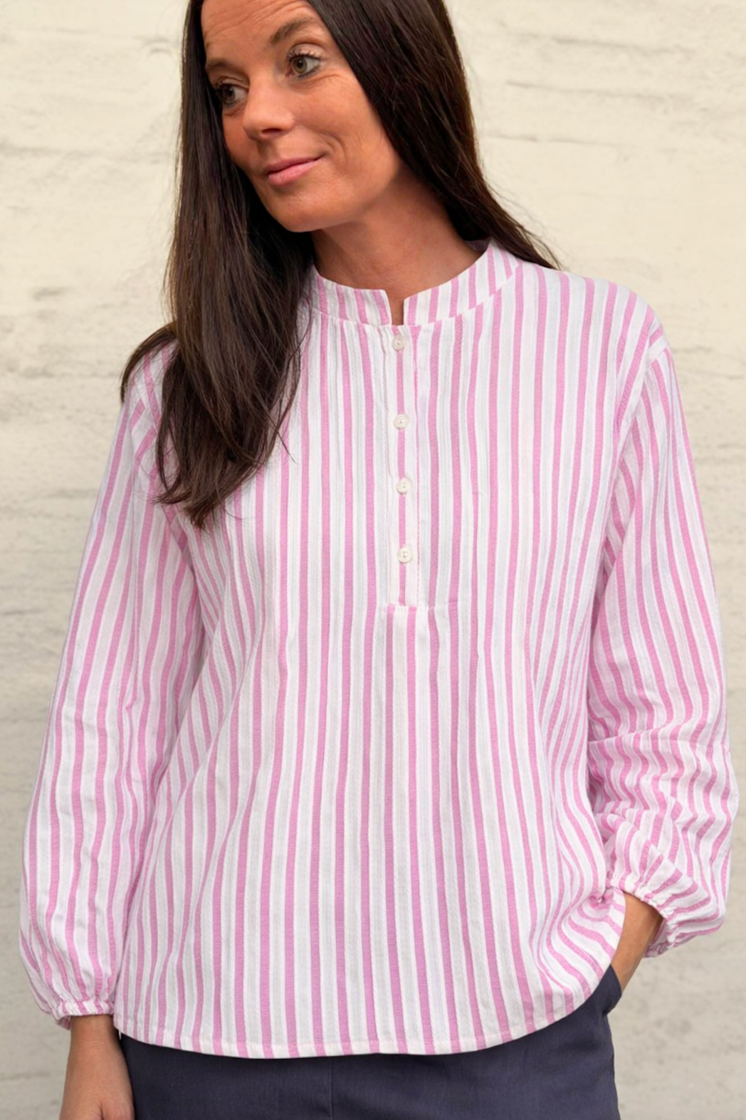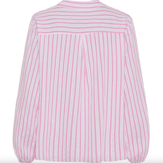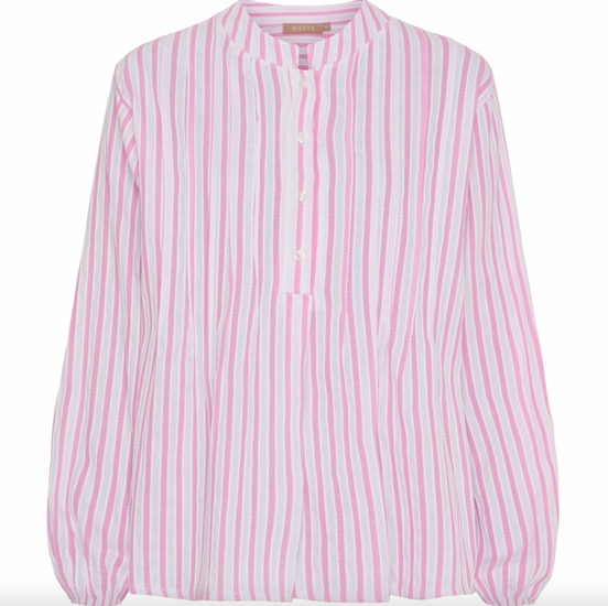 Skjorte Maren er en stripet skjortebluse i et enkelt og tidløst snitt. Den rosa fargen gir et mykt, feminint uttrykk, mens de rolige stripene gjør den enkel å kombinere med resten av garderoben. En lett overdel som fungerer både alene og som et lag under en jakke.